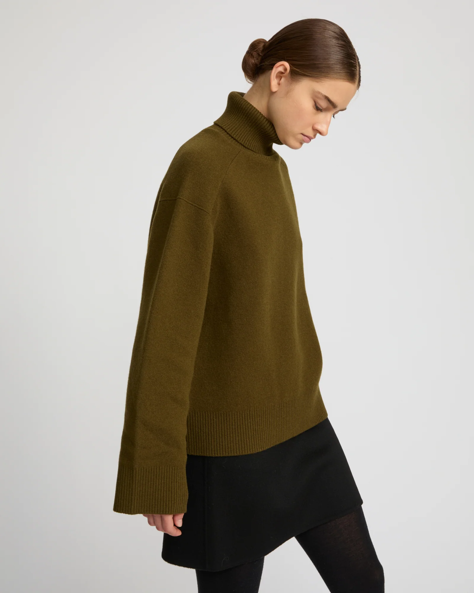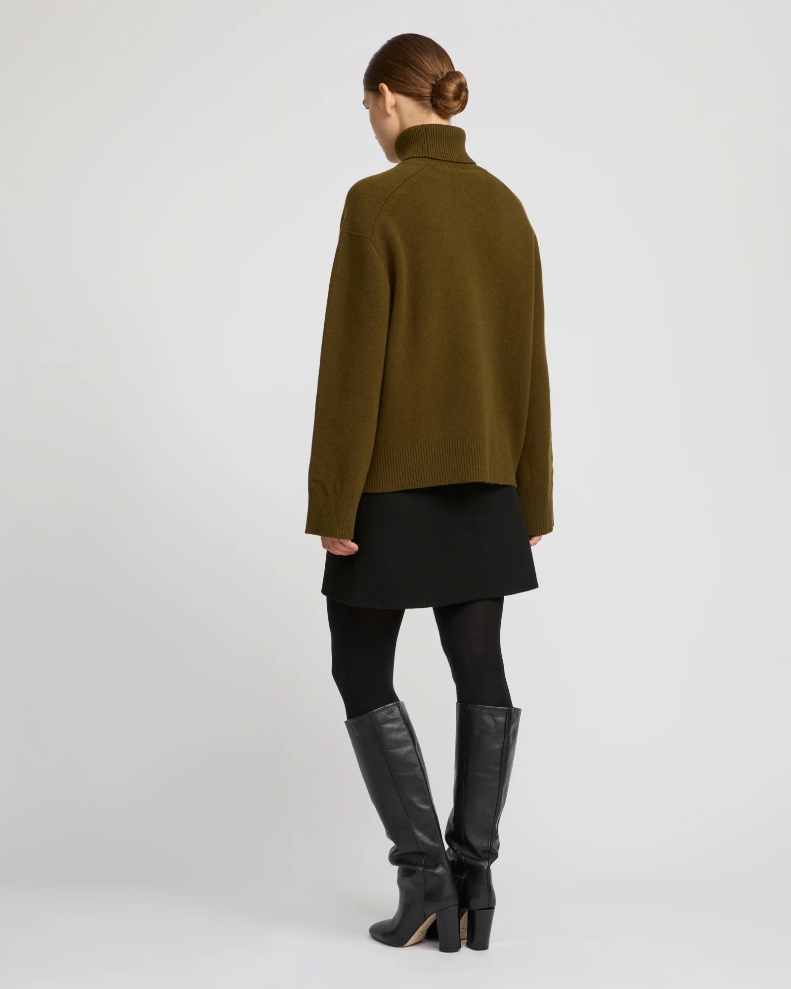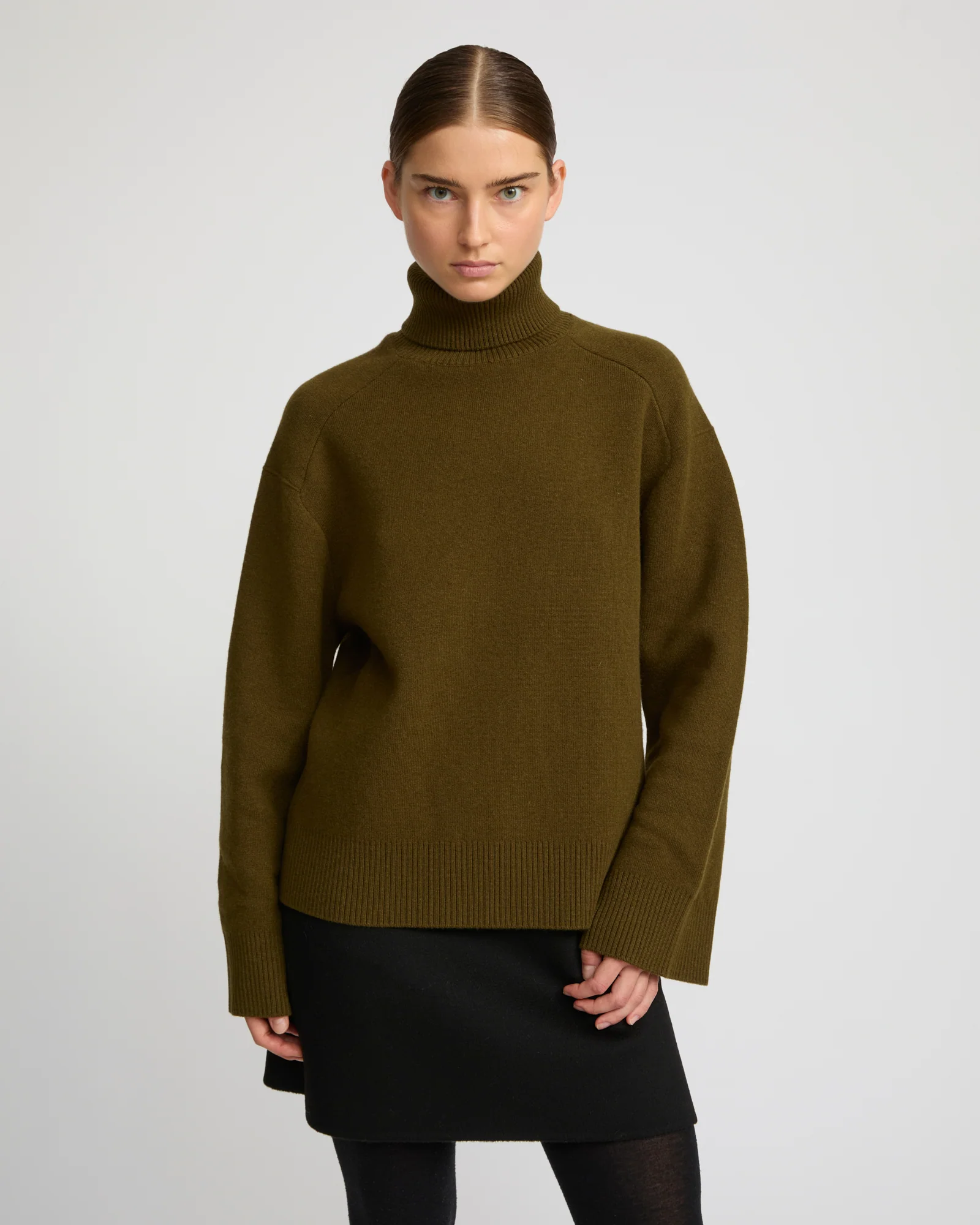 The perfect fall of a generous wool knit for this polo-neck sweater with impeccable lines. Ribbing at the cuffs and hem bring a clean visual elegance to this winter essential.