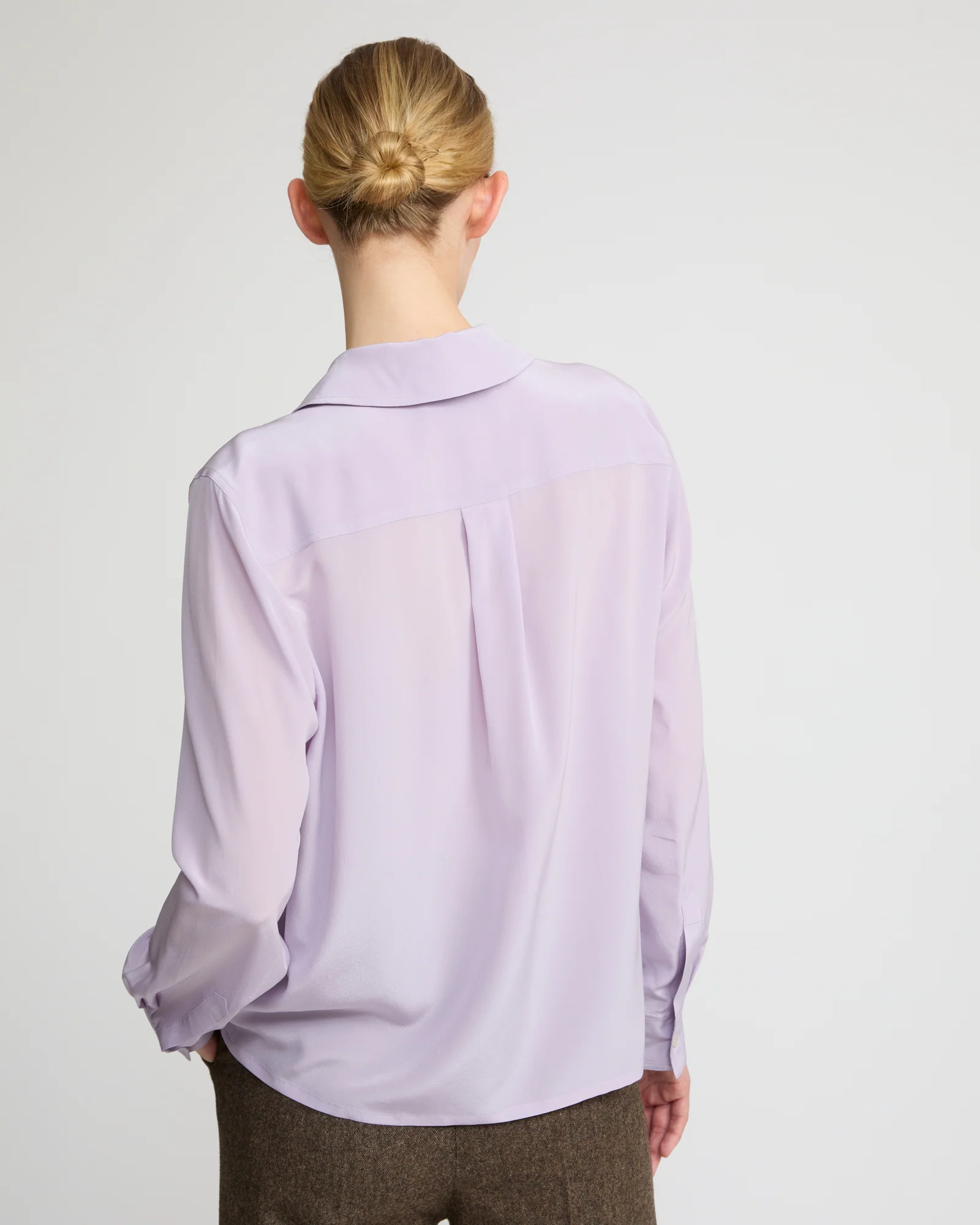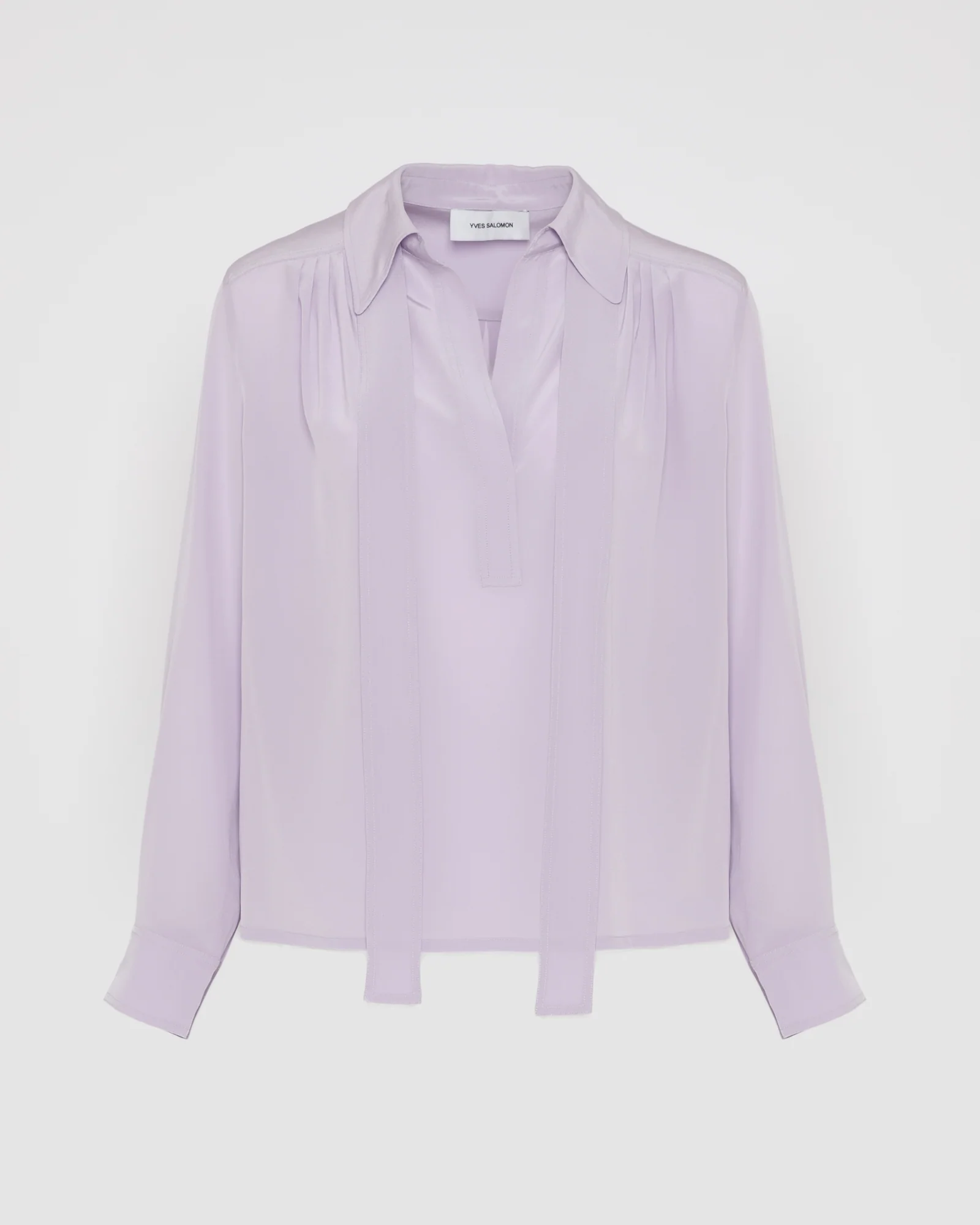 A loose shape and polo collar for this blouse worked in a fluid silk crepe. A large removable ascot bow offers a variety of options for the wearer.