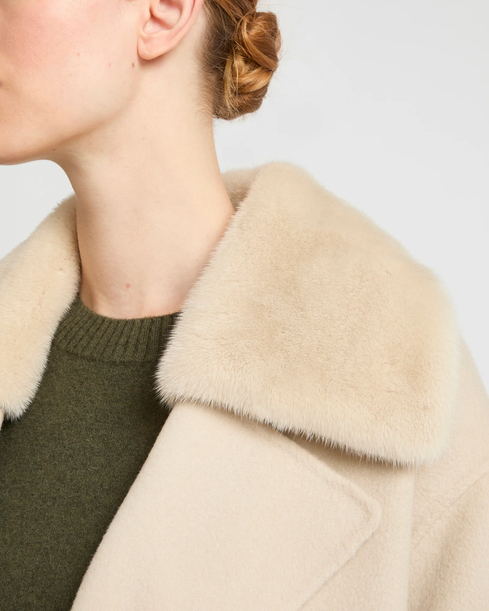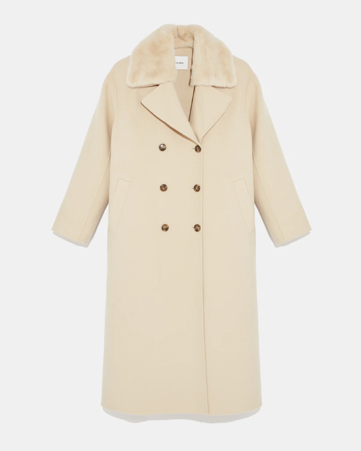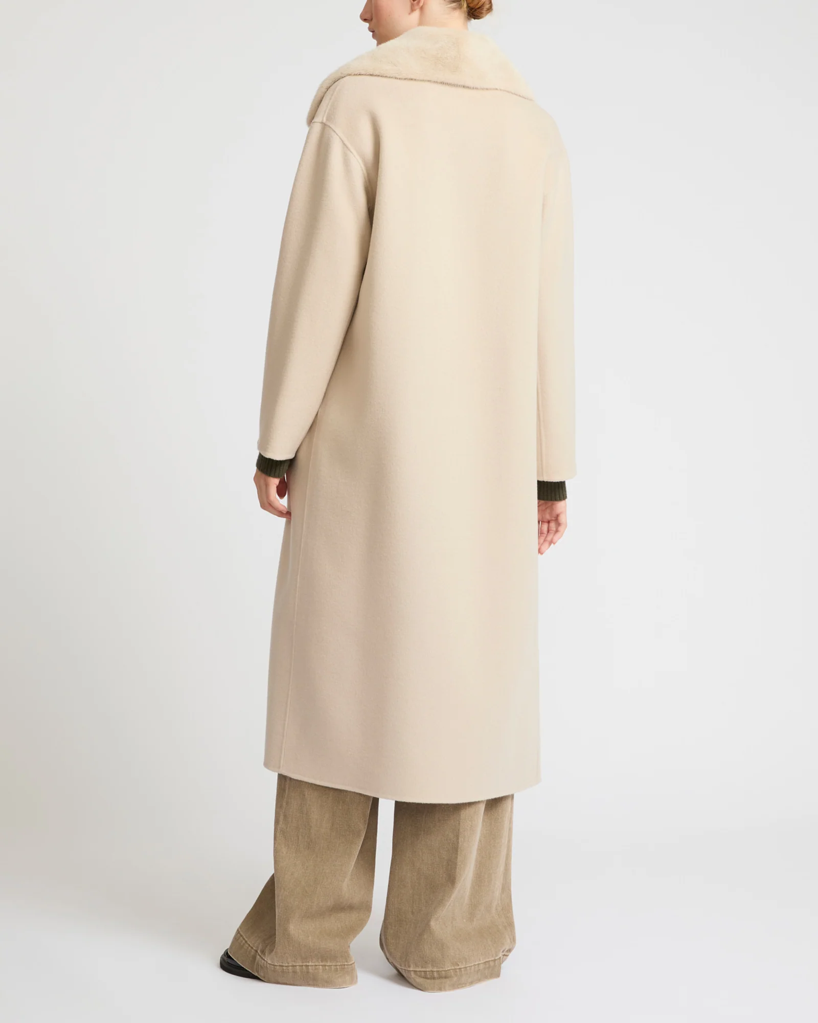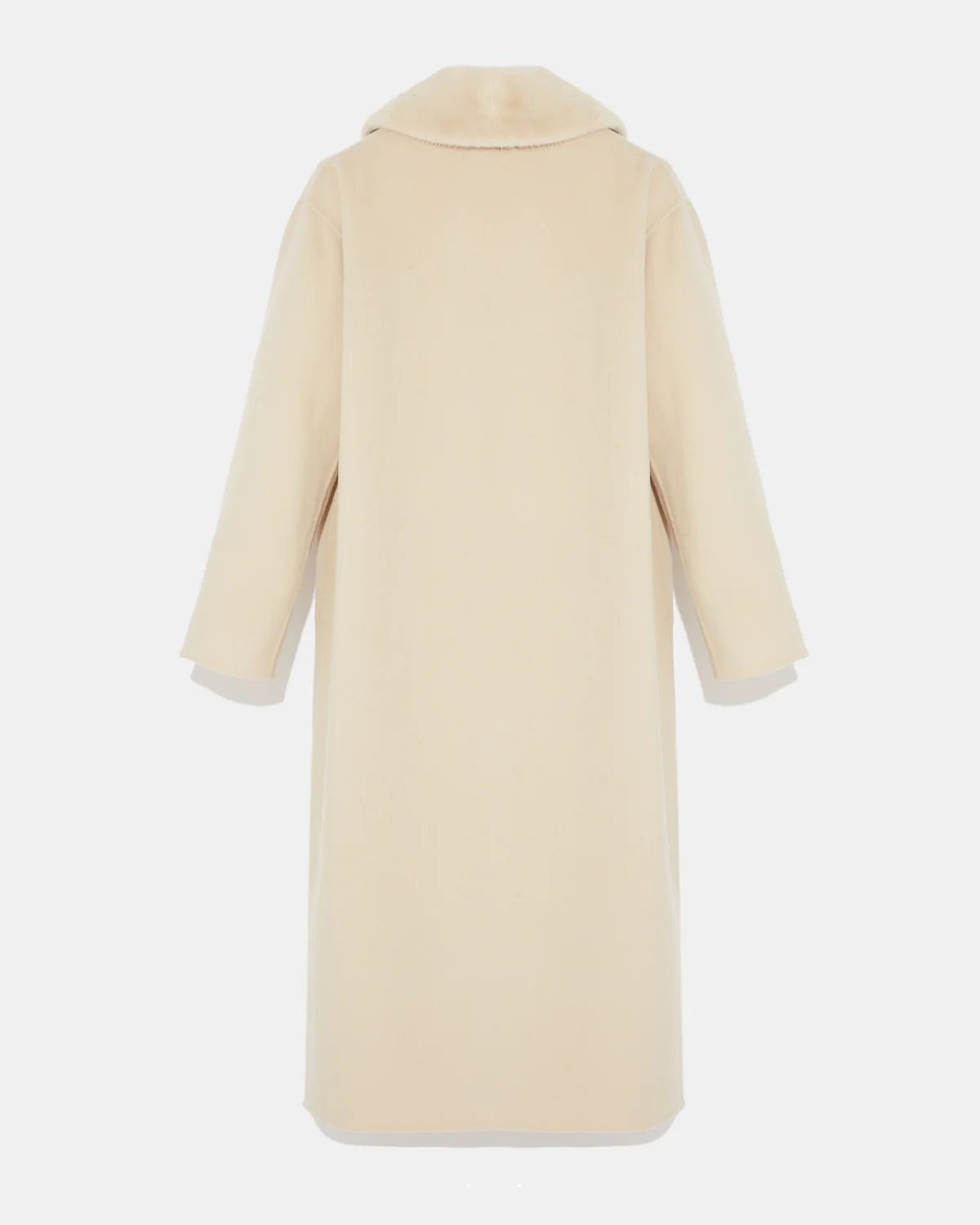 A long and straight coat with a masculine feminine style. Made from double-sided cashmere wool, this model is warm and enveloping yet comfortable to wear. Featuring a tailored collar, a double-breasted fastening and slit pockets, its design is elegant and timeless. The removable mink fur collar adds contrast and a touch of femininity. A detail that makes all the difference and fastens perfectly to the coat using a concealed button system.