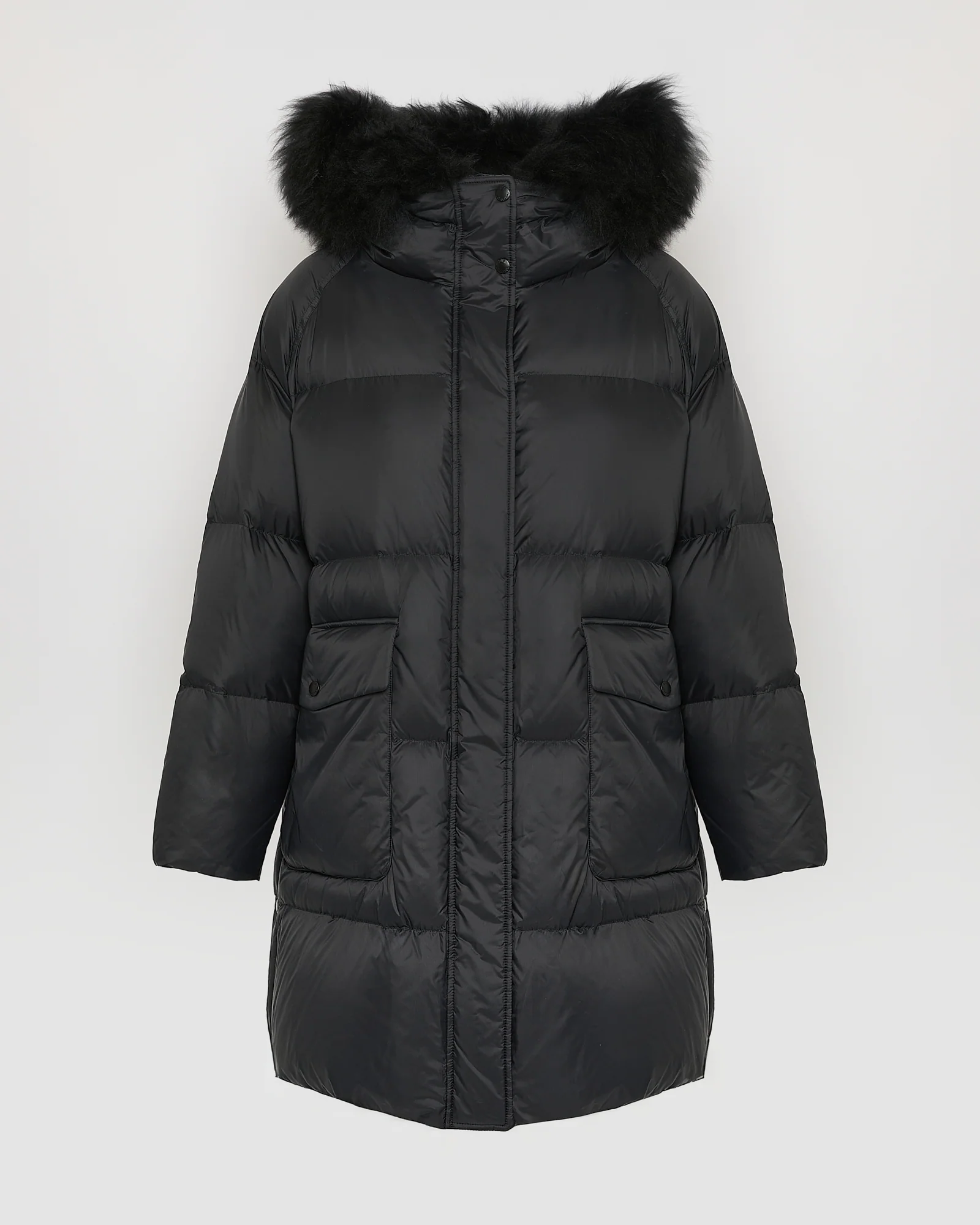 Tested at -10°C, this long down jacket offers matchless protection against the cold and weather conditions thanks to its technical fabric and high quality down lining. A removable hood trim features airy, long-haired lambs wool for an elegant visual touch and extra versatility.