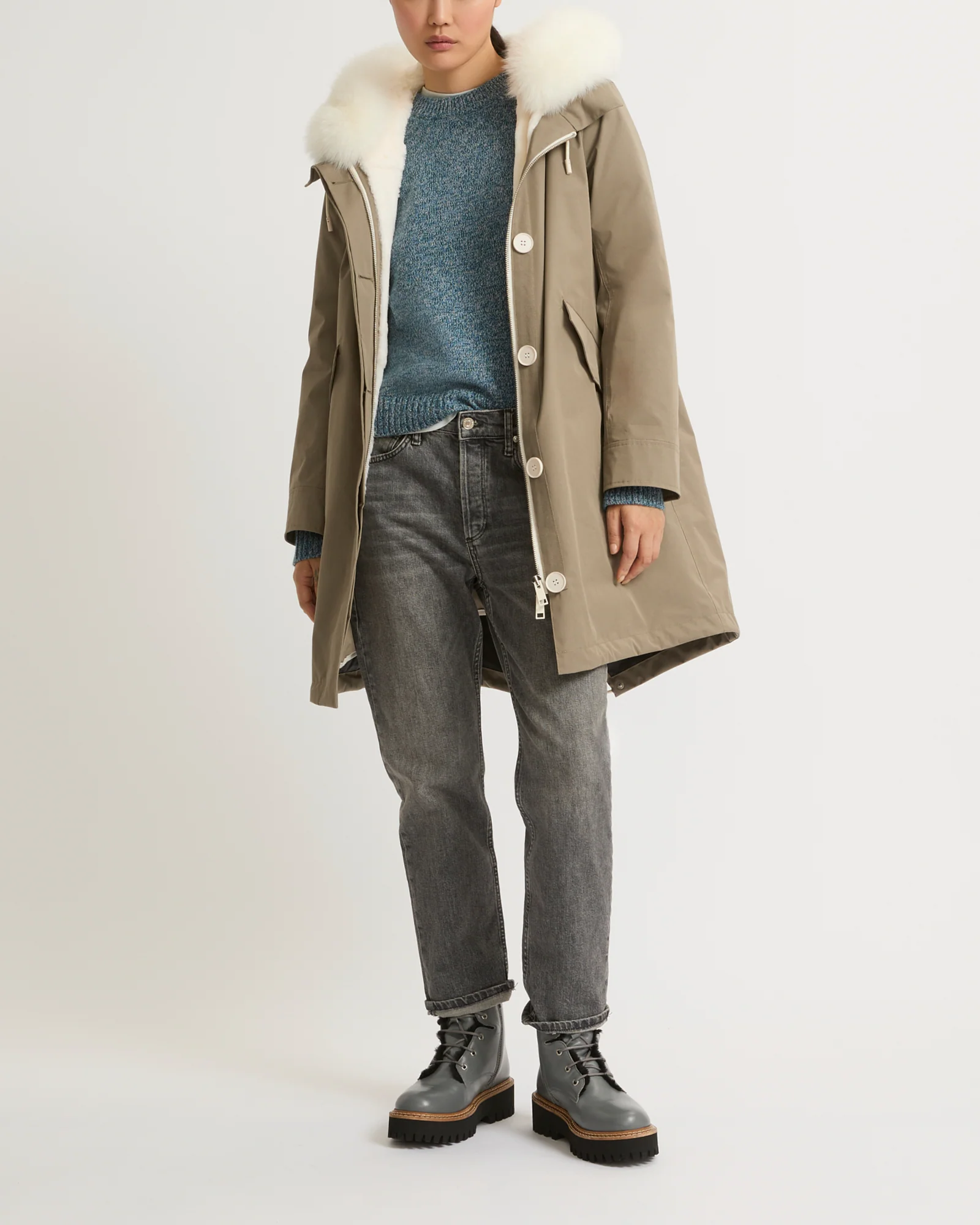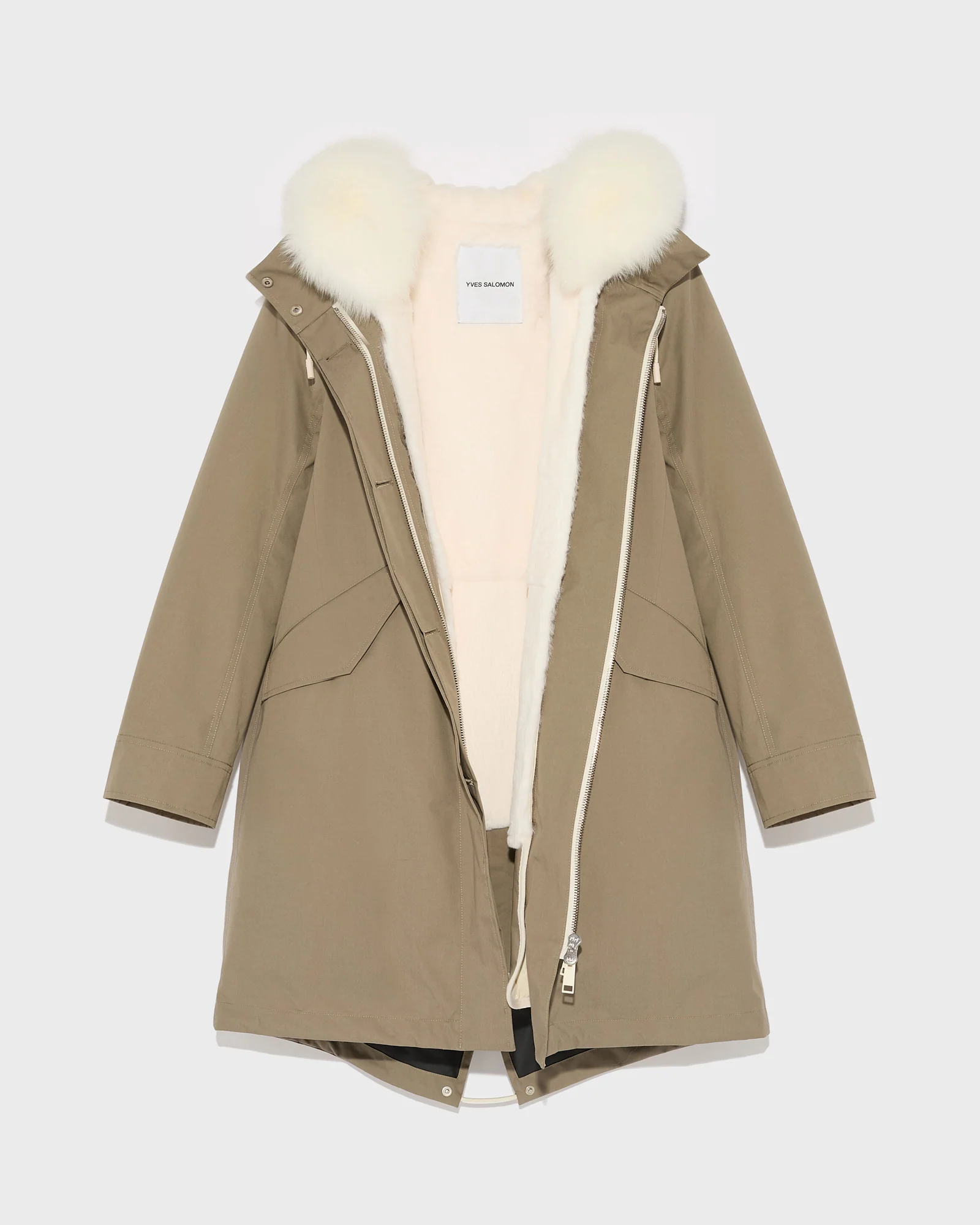 Crafted from a weather-resistant cotton blend, this regular parka has a flared cut and a pared back silhouette. Design details include a concealed zip and button fastening, two flap pockets, an inside pocket and a fishtail finish in the back. Drawstrings at the waist and bottom allow the fit to be adjusted for a more feminine and contemporary look. Warm and enveloping, this model has a detachable hood trim in fox fur, as well as a removable lining in sheared rabbit featuring padded sleeves filled with high-quality feathers and down, as well as ribbed finishes. Functional and timeless, this parka is versatile to match the season.
