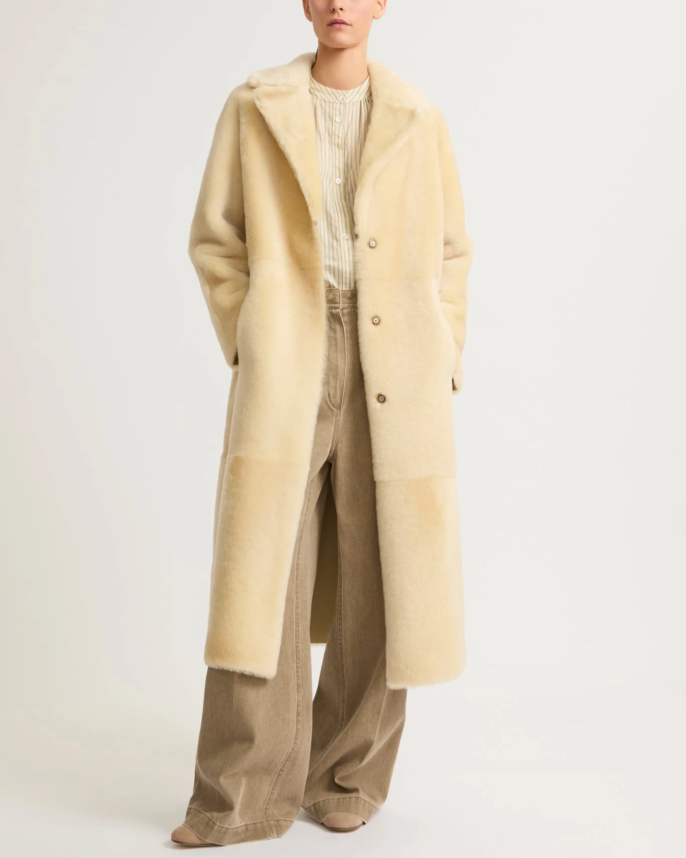 Long reversible coat featuring a masculine-feminine look. Crafted from unlined shearling, the leather on the other side is smooth and fine. Warm and enveloping, it remains supple and easy to wear. Design details include a tailored collar, a straight cut and two slit pockets for a pared back silhouette. The press-stud fastening adds a functional aspect, while the waistband allows the shape to be fitted for a contemporary and feminine touch.