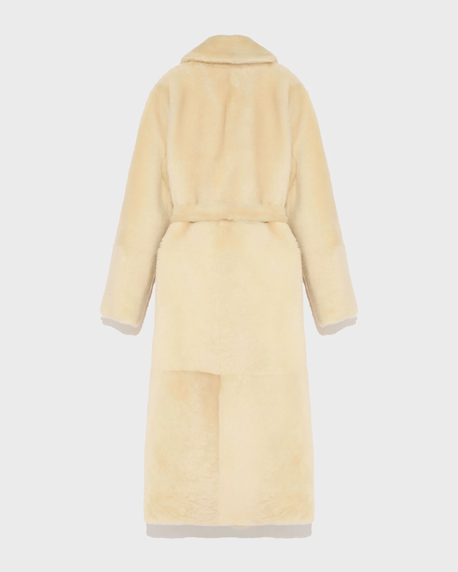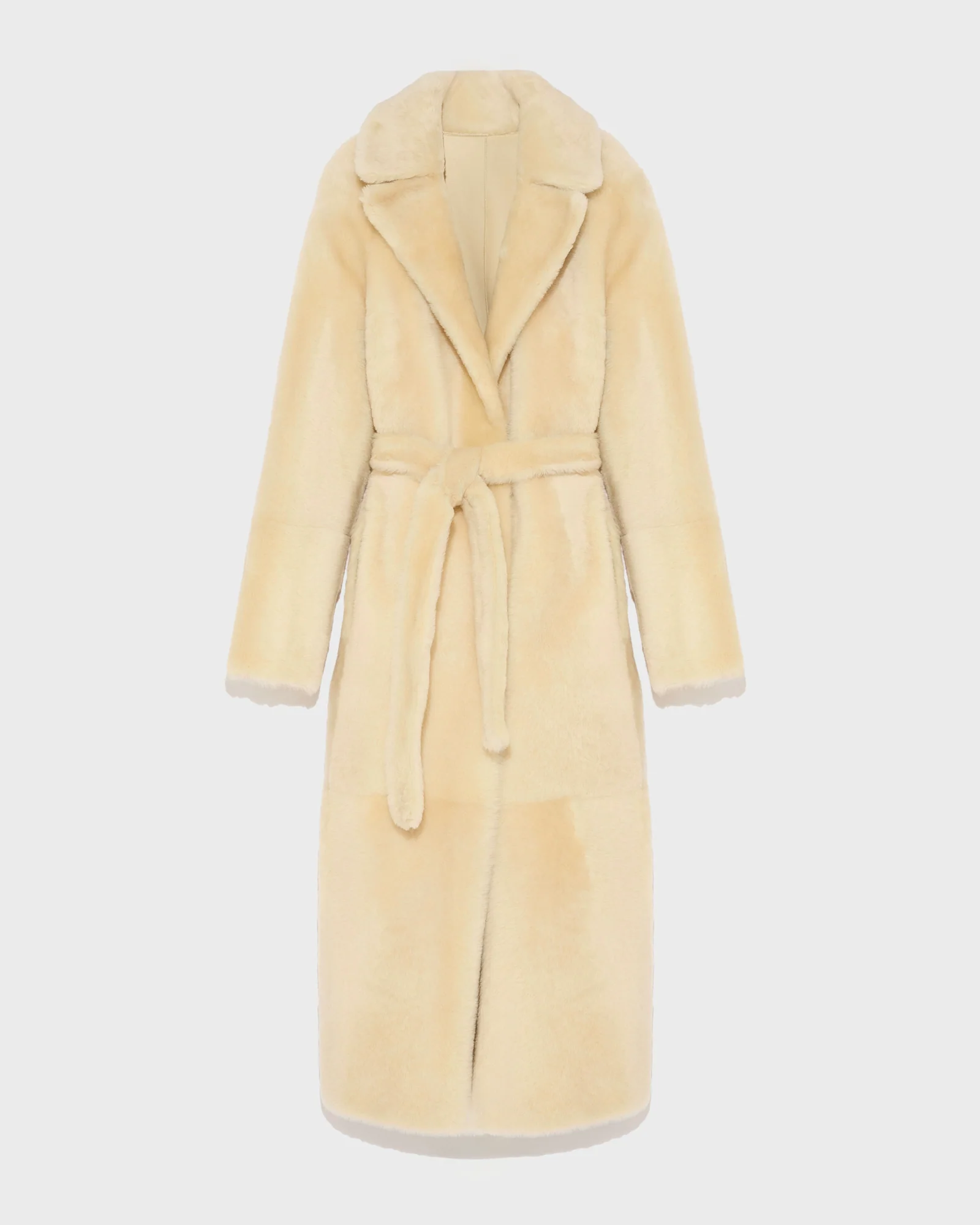 Long reversible belted shearling coat