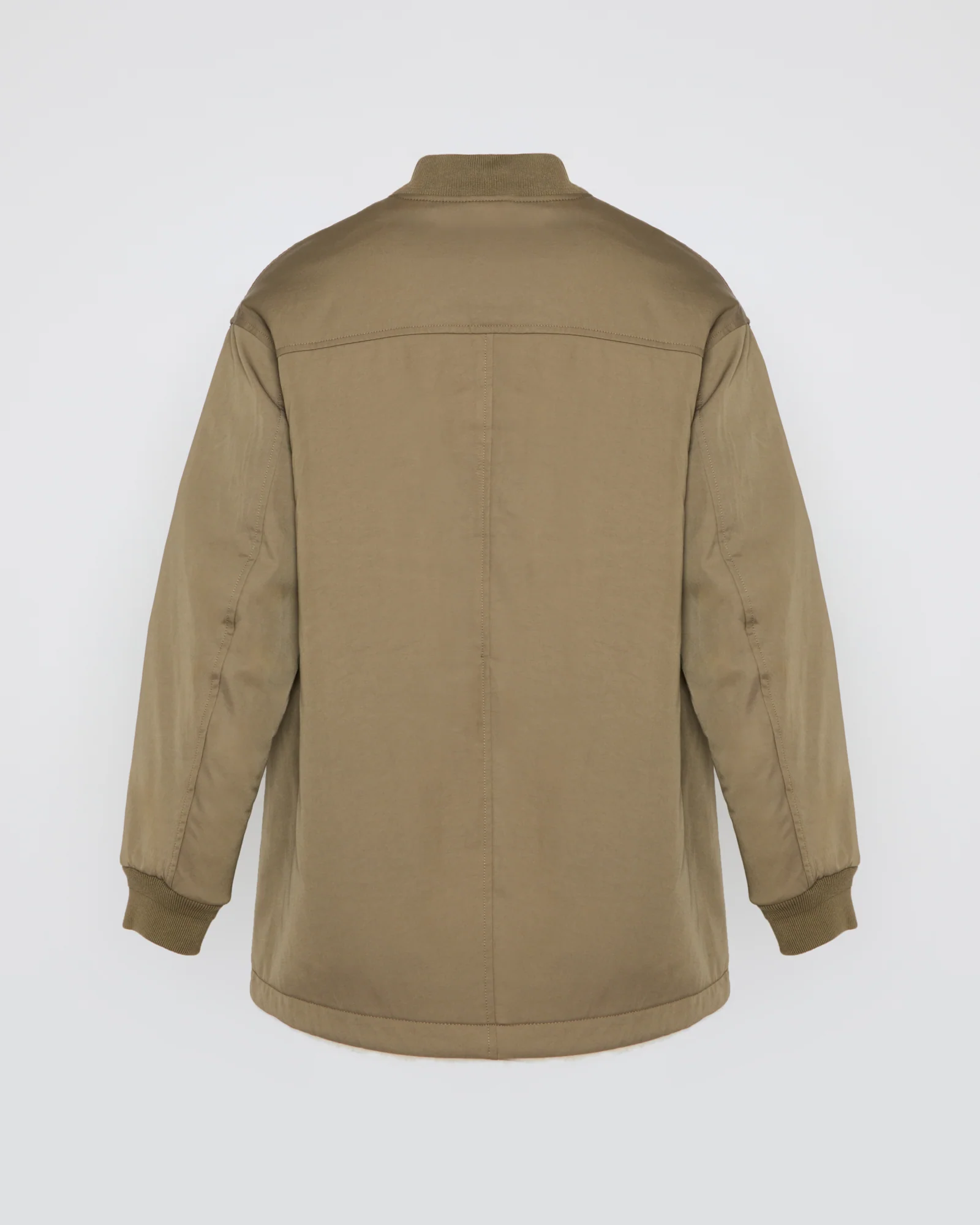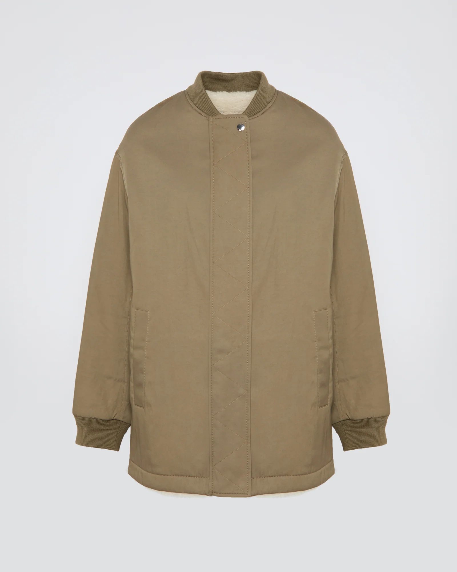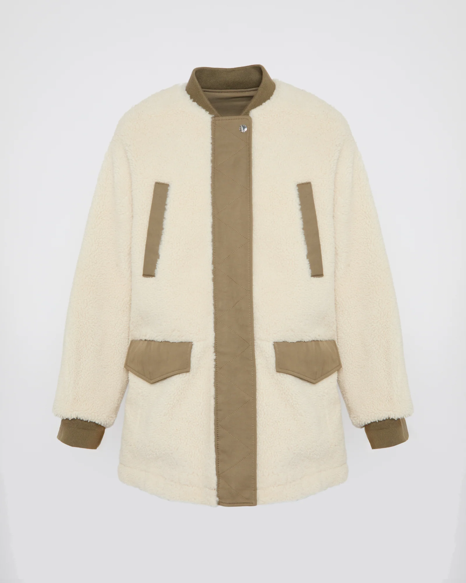A contemporary interpretation of the teddy jacket, balancing softness and structure. Reversible, it reveals on one side a khaki drill with an urban attitude, and on the other, a cream shearling with an enveloping touch. Its straight cut and protected zip closure create a clean, streamlined silhouette, highlighted by ribbed trims at the collar and cuffs. Patch pockets on the shearling side and slit pockets complete this perfectly balanced piece, designed for modernity and comfort.