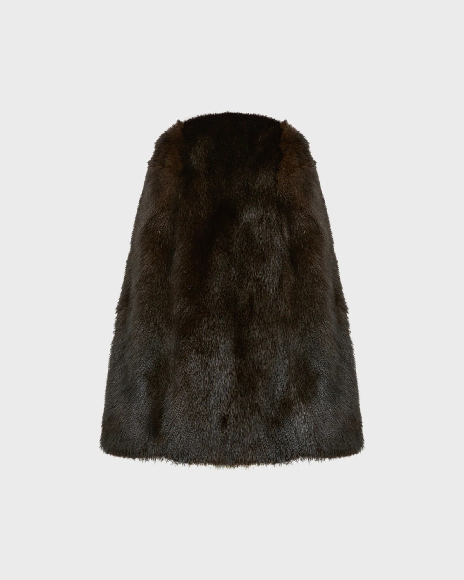 The final touch for an elegant winter silhouette, this hood highlights the soft thickness of mink fur. Its simple lines frames the face and close under the chin with studs covered in matching leather.