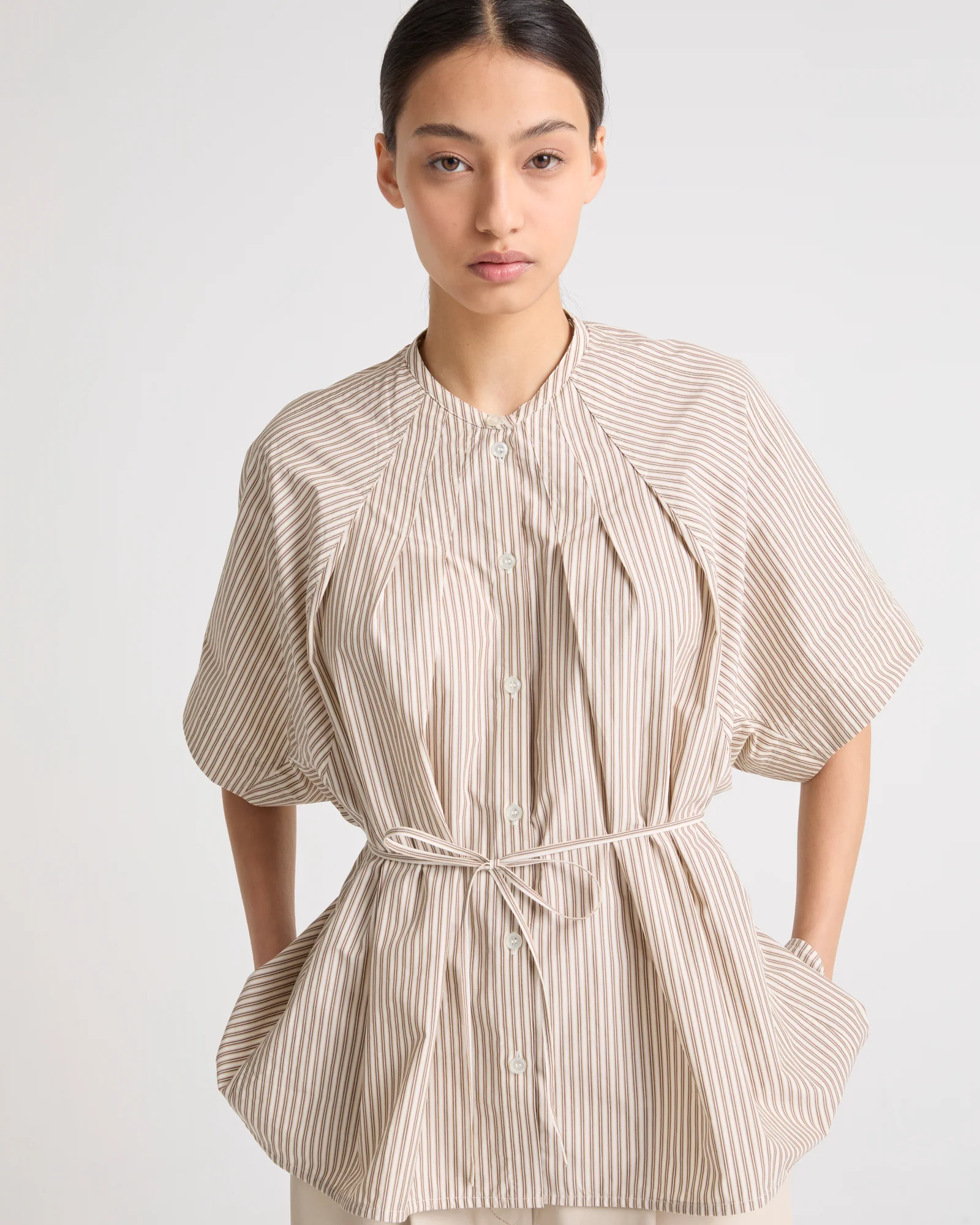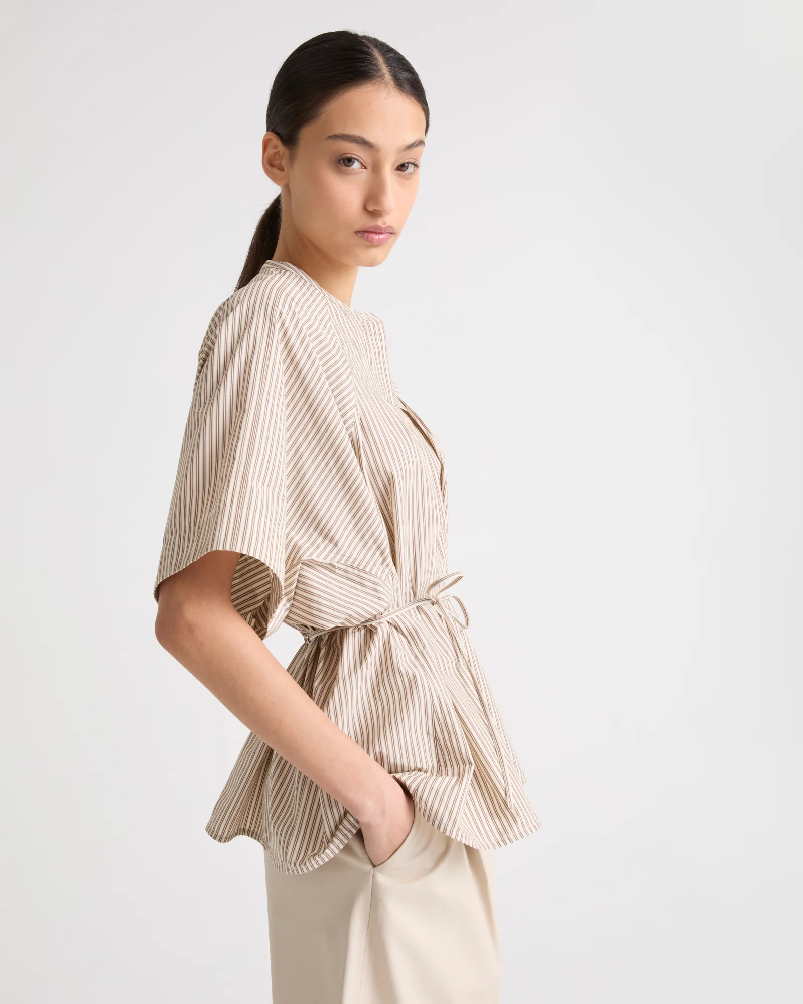 The lightness of cotton poplin suits this little shirt with an officer collar, to be worn cinched with a matching fastening.