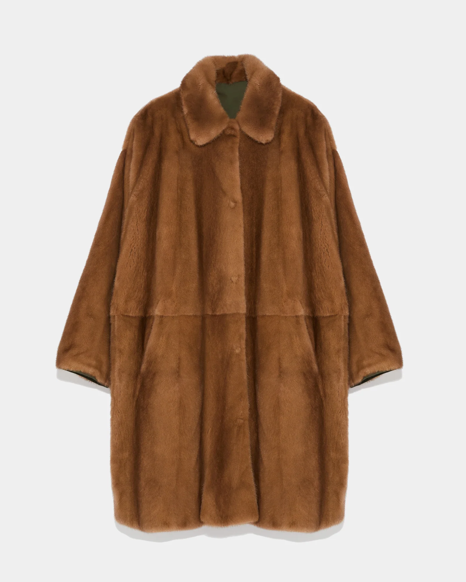 Long reversible coat with a versatile style thanks to its two complementary sides: one in water-repellent technical fabric and the other in mink fur noted for its softness and durability. Featuring a shirt collar and a concealed front press-stud fastening, it has two flap pockets on the fabric side and two slit pockets on the mink one. On each side, press-stud slits add ease and a functional touch. Somewhere between an overcoat and a parka, this warm and enveloping winter piece offers a resolutely modern look.