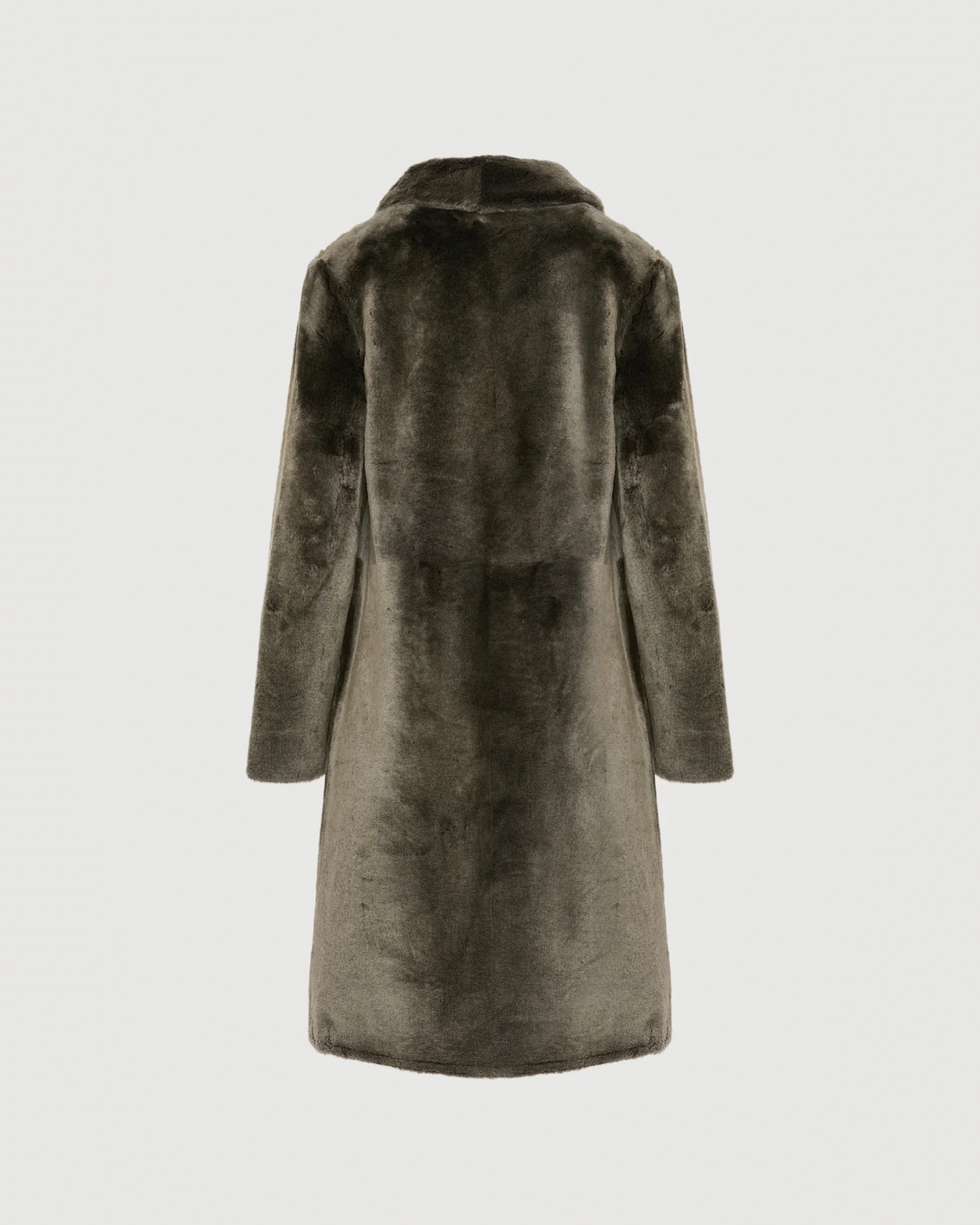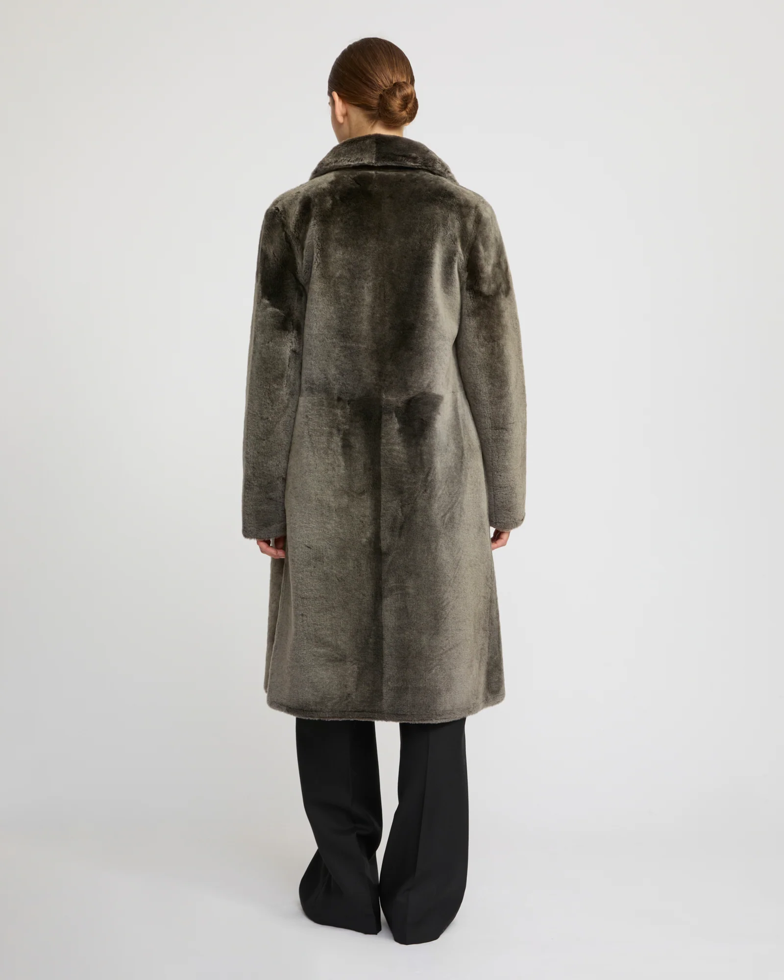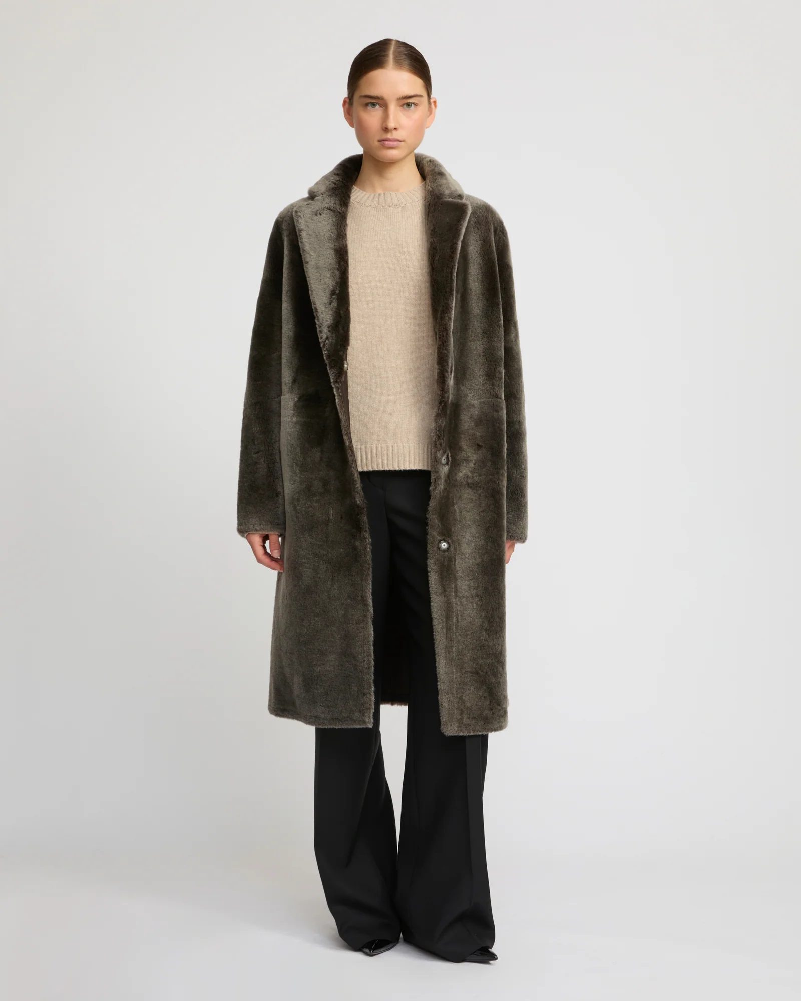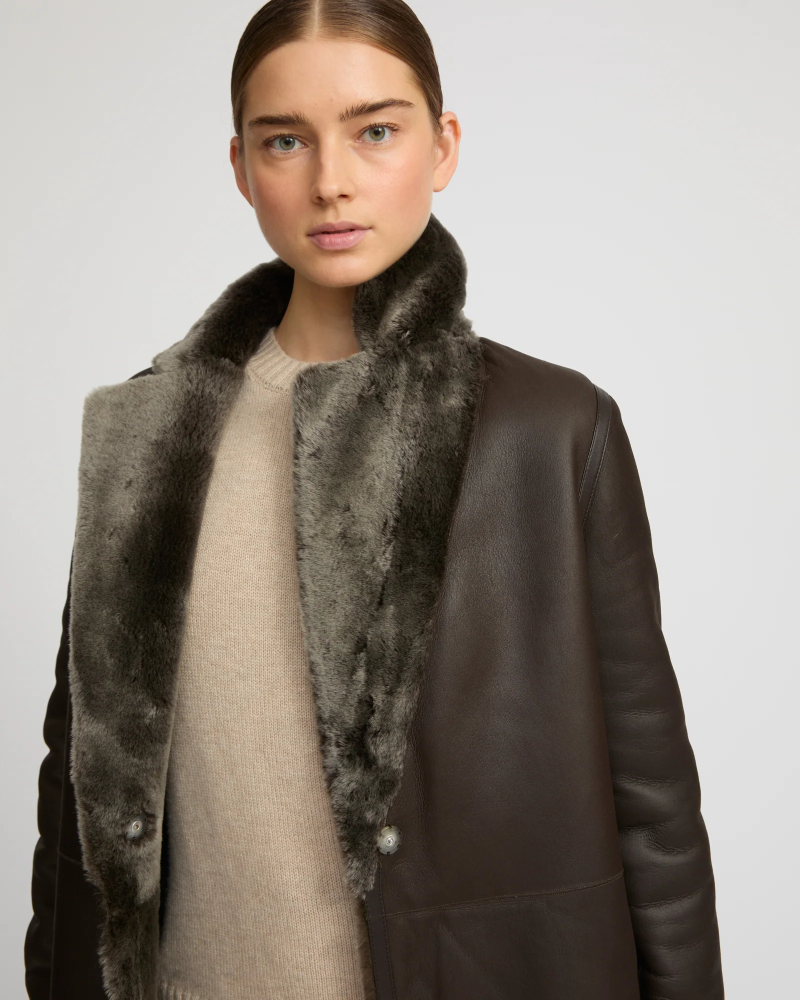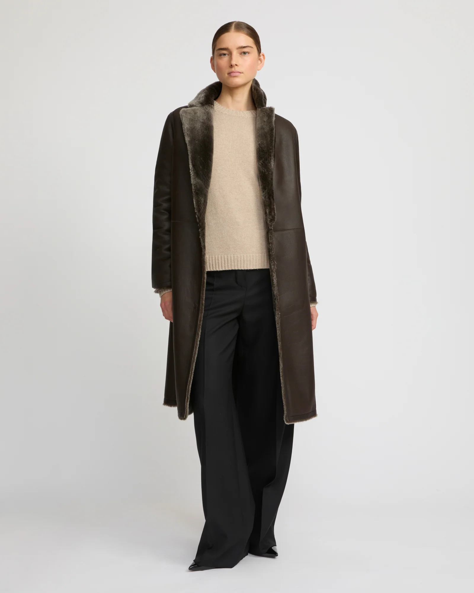 Long reversible shearling coat featuring a masculine feminine look crafted from merino with one side in smooth leather. Warm and enveloping, it remains supple and easy to wear. Design details include a tailored collar, a straight cut, two slit pockets and a front press-stud fastening for a pared back silhouette. An elegant yet functional coat to embrace winter with ease and style.