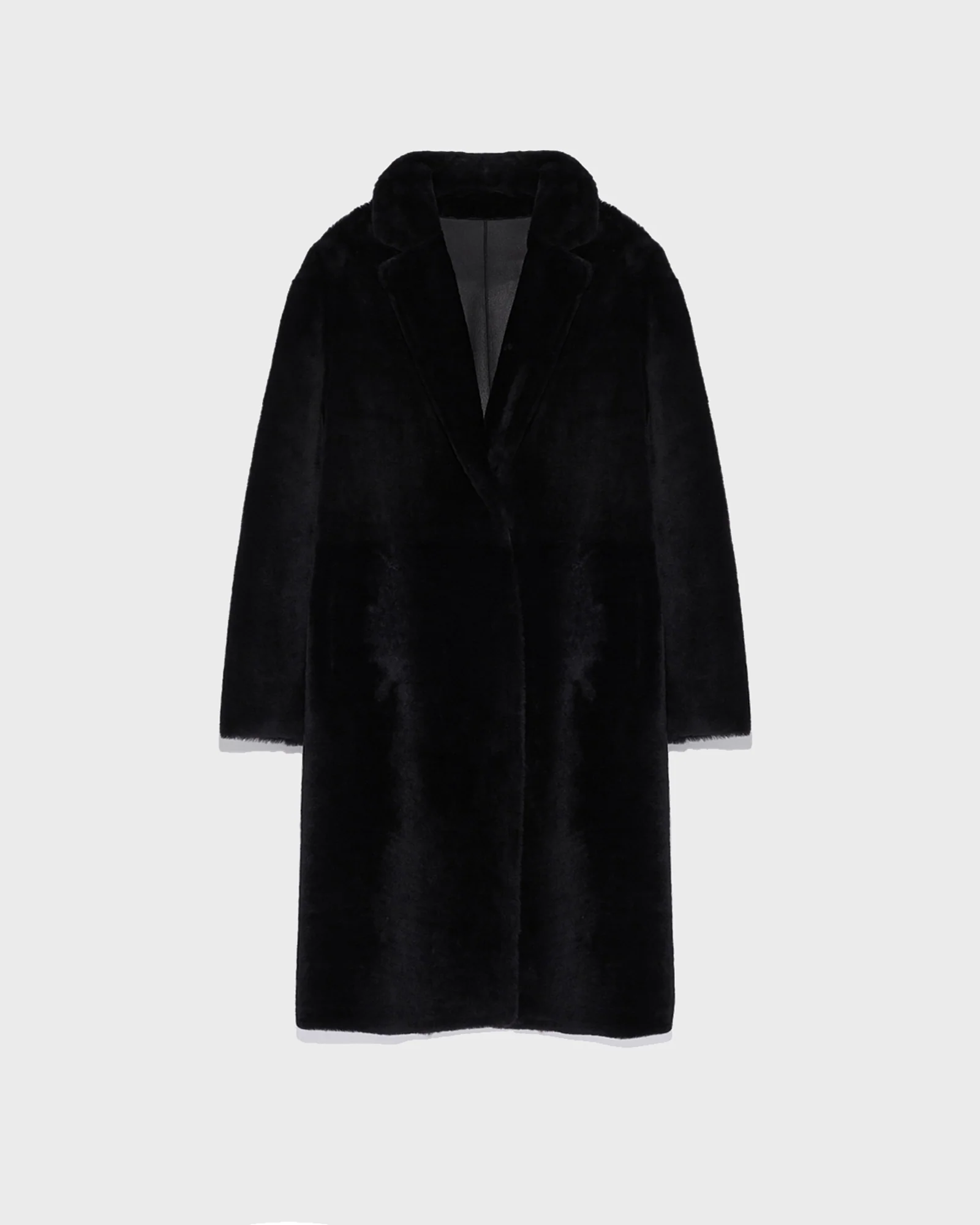 Long reversible shearling coat featuring a masculine feminine look crafted from merino with one side in smooth leather. Warm and enveloping, it remains supple and easy to wear. Design details include a tailored collar, a straight cut, two slit pockets and a front press-stud fastening for a pared back silhouette. An elegant yet functional coat to embrace winter with ease and style.
