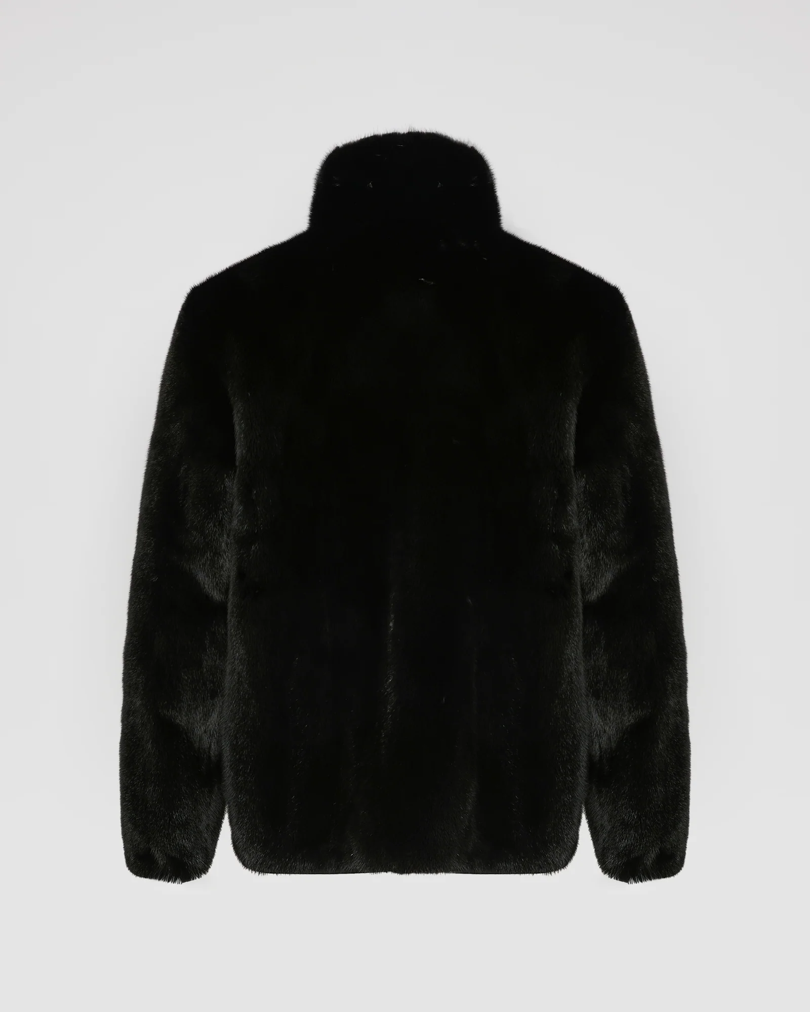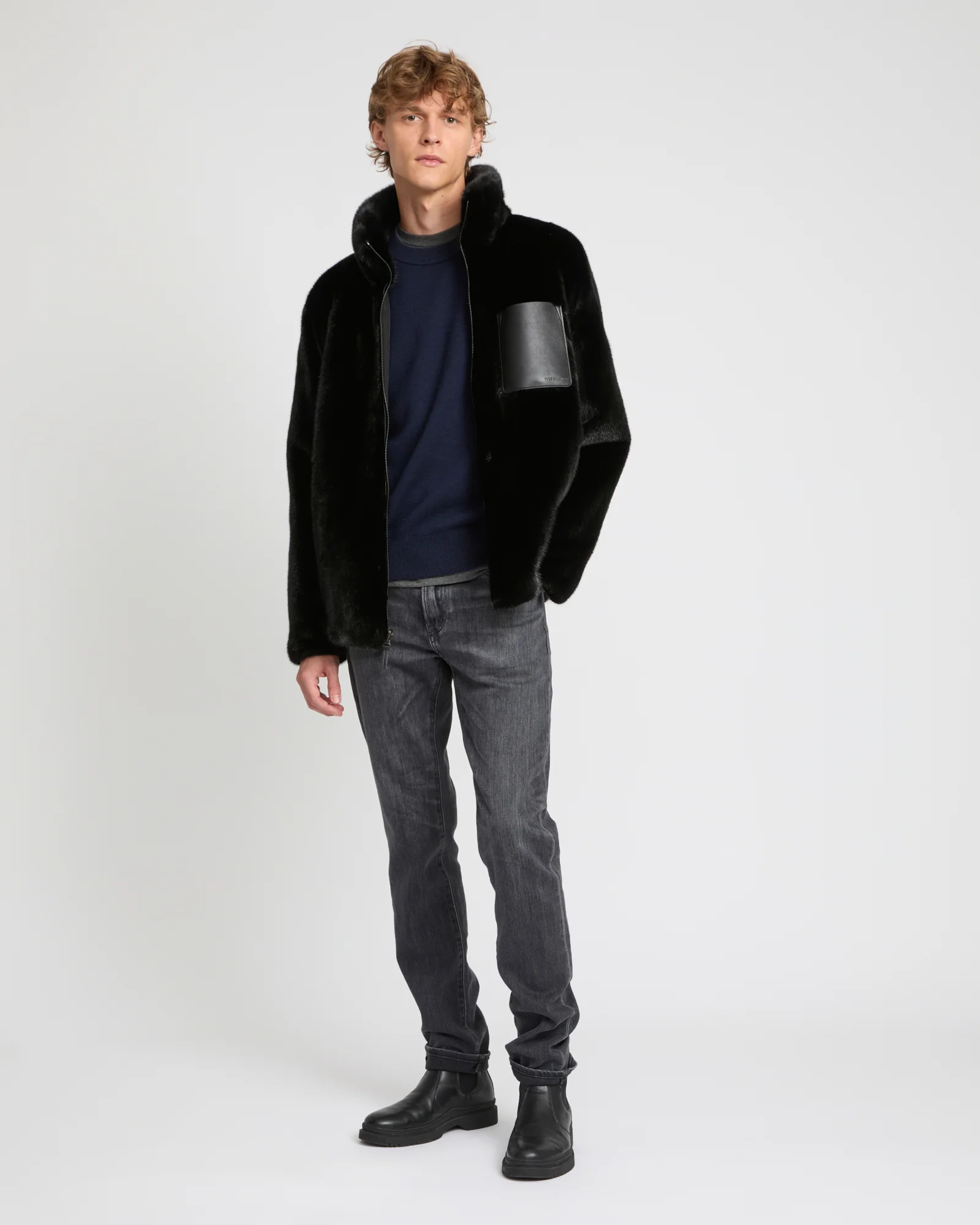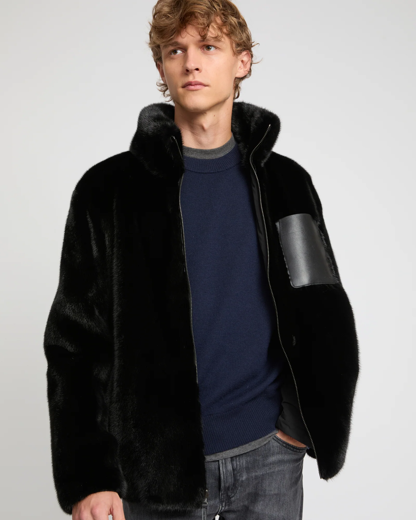 Of the classic fleece, this elegant, refined design has kept only the original shape. A side in softest mink and a side in technical fabric combine to create a jacket which can be work layered or alone. Leather detailing provides additional refinement.