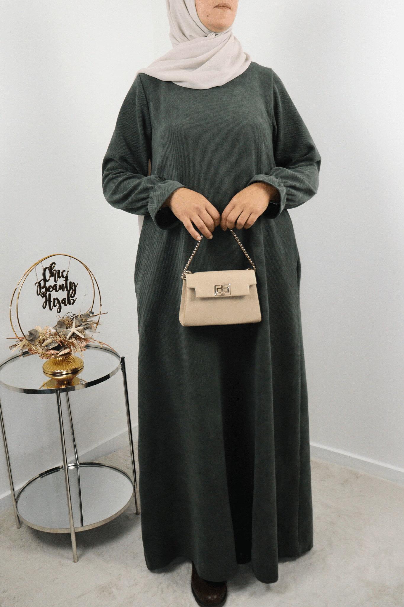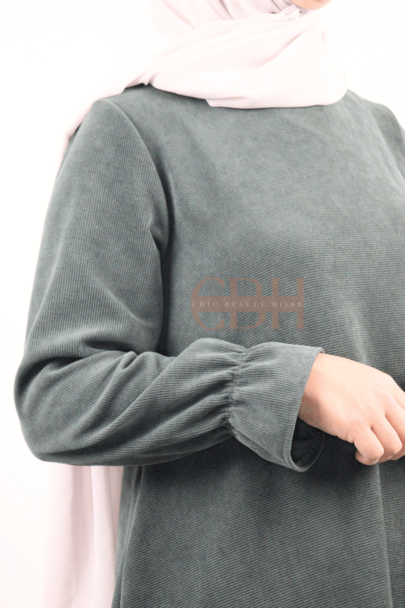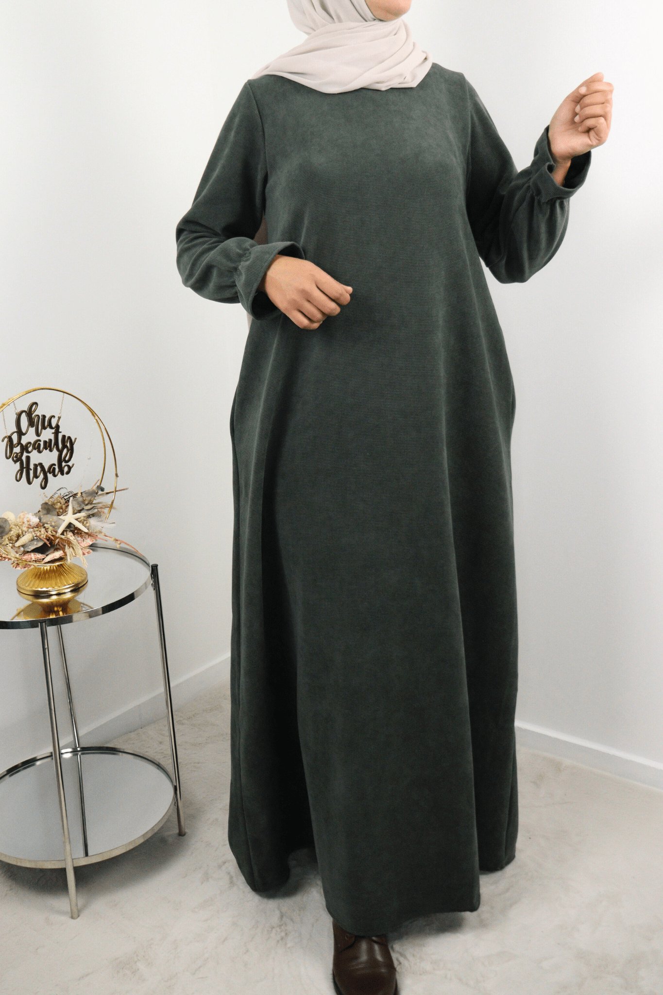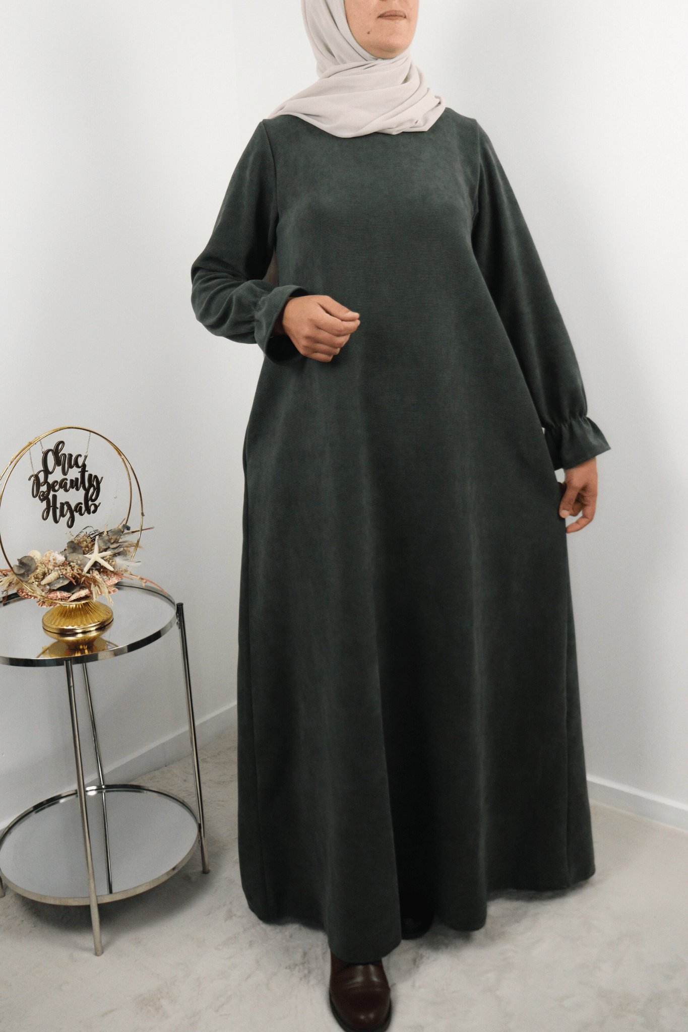 Portée seule ou sous un manteau, avec des bottines ou des baskets selon vos préférences, cette abaya velours côtelé manches tulipe offre un look polyvalent et chic pour l’hiver.