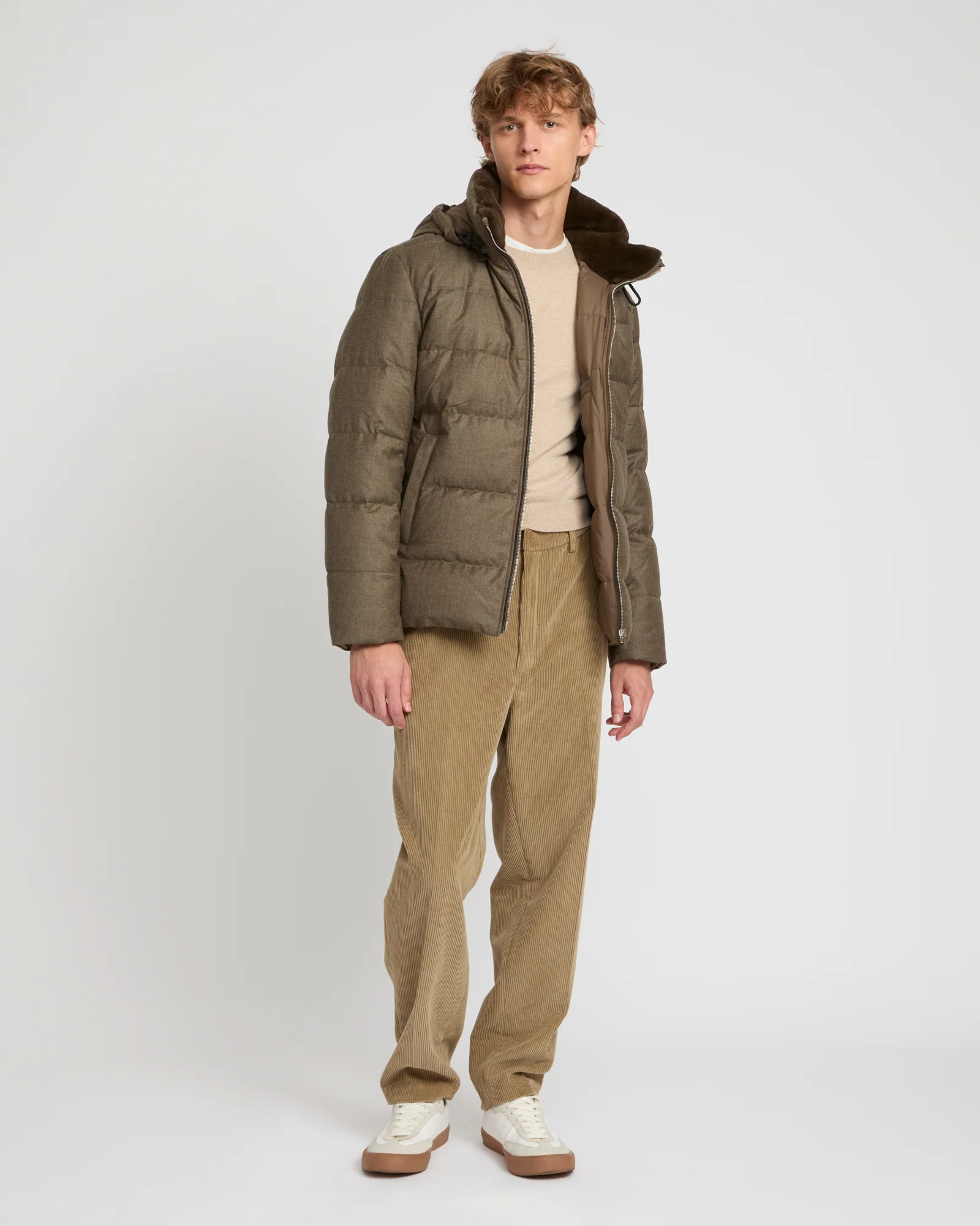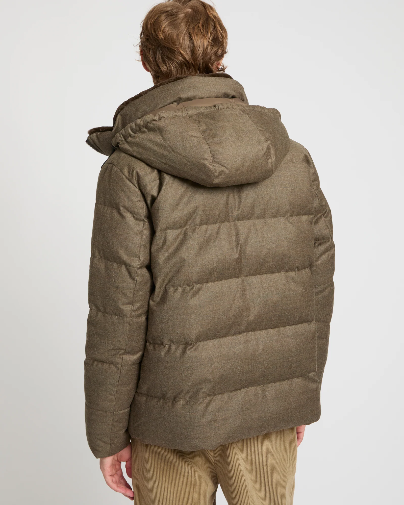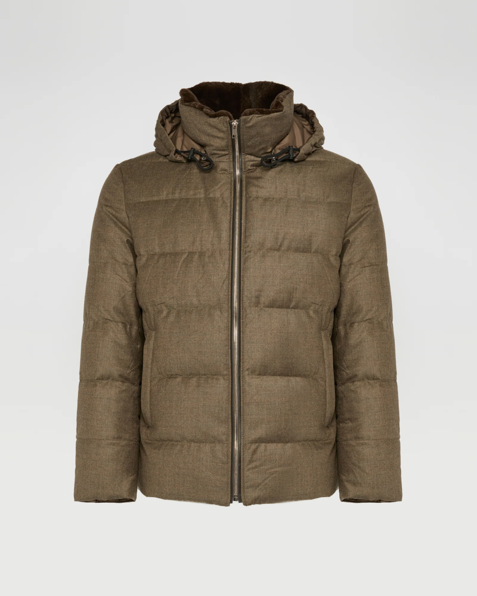 This short down jacket with pared-down lines offers the double elegance of an inner collar in shaved mink fur, and an outer layer in Loro Piana wool-silk fabric, which uses the Storm System technique to ensure absolute protection against the elements. The jacket also features a removable hood and leather details for an impeccable finish.