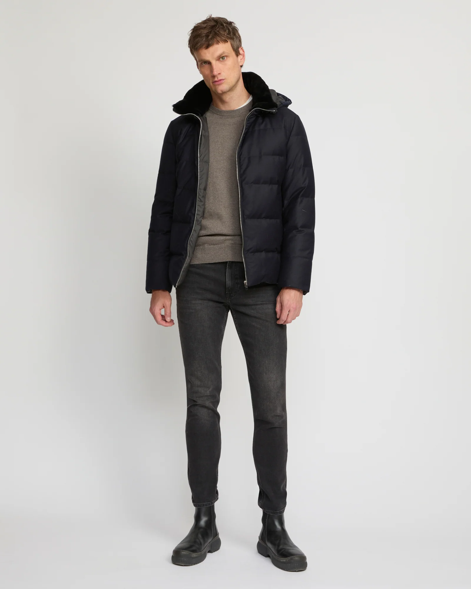 This short down jacket with pared-down lines offers the double elegance of an inner collar in shaved mink fur, and an outer layer in Loro Piana wool-silk fabric, which uses the Storm System technique to ensure absolute protection against the elements. The jacket also features a removable hood and leather details for an impeccable finish.