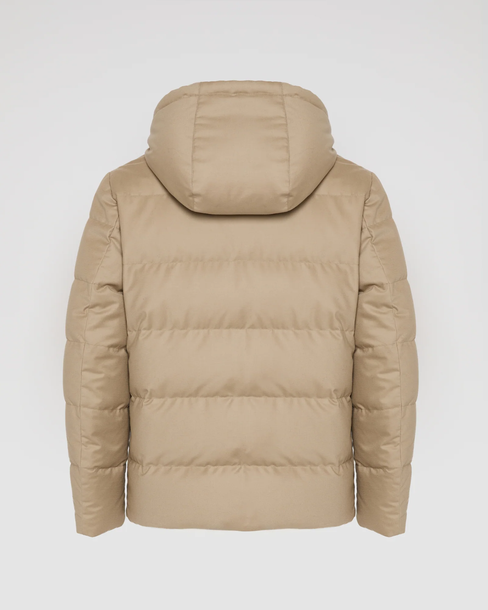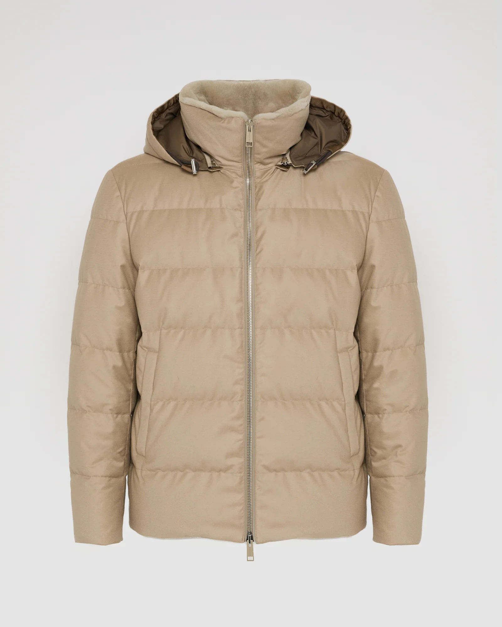 This short down jacket with pared-down lines offers the double elegance of an inner collar in shaved mink fur, and an outer layer in Loro Piana wool-silk fabric, which uses the Storm System technique to ensure absolute protection against the elements. The jacket also features a removable hood and leather details for an impeccable finish.