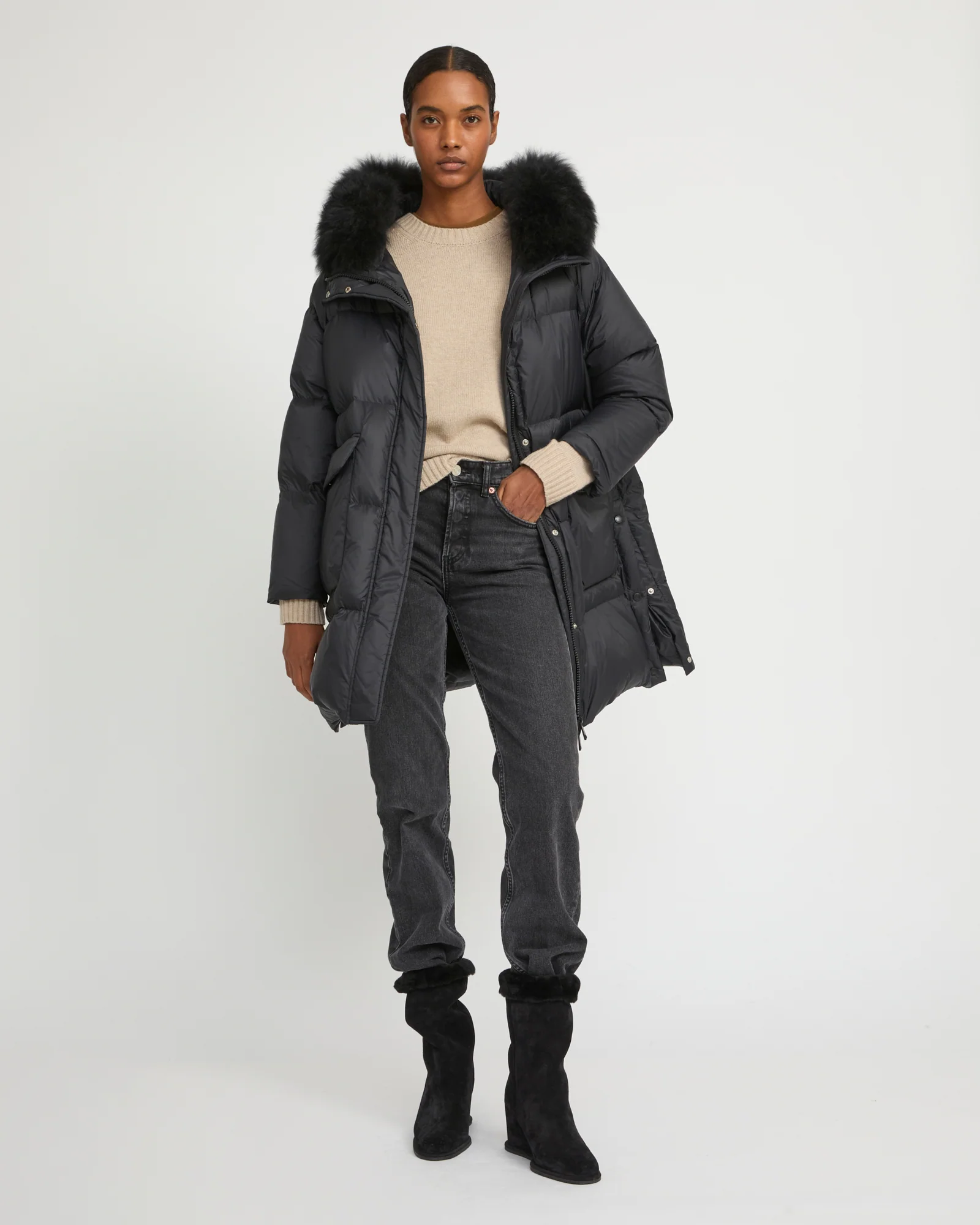 A contrast of materials for this short, smooth puff jacket in Loro Piana flannel fabric with detachable fox fur collar. Worked in a Loro Piana flannel fabric, which uses the Storm System technique to ensure absolute protection against the elements. The long hair of soft, dense fox fur provides a visual element as well as added warmth on a removable collar and the wrists of matching mittens, which can be clipped to the jacket for ease of use. Zipped front and sporty, boxy shape.