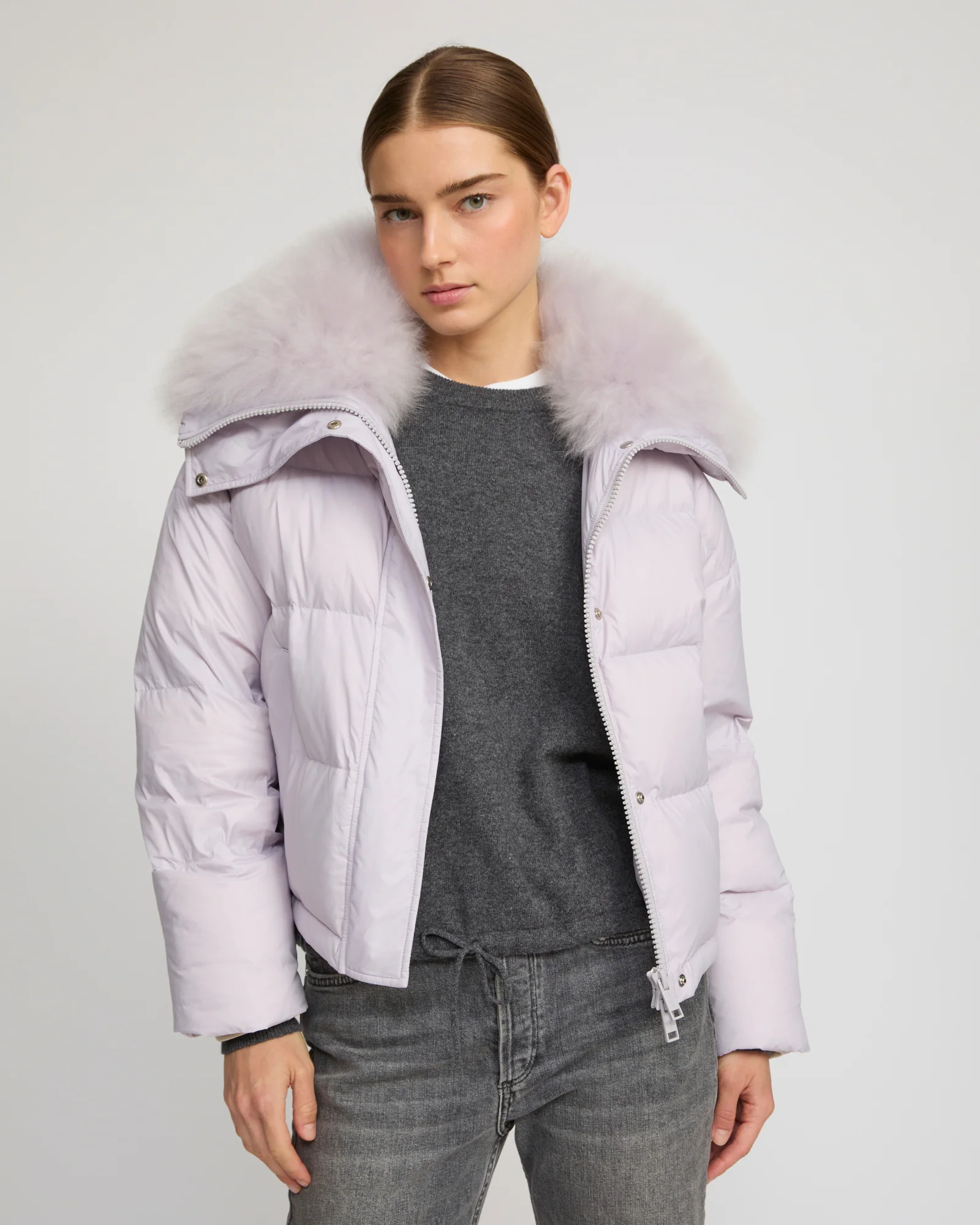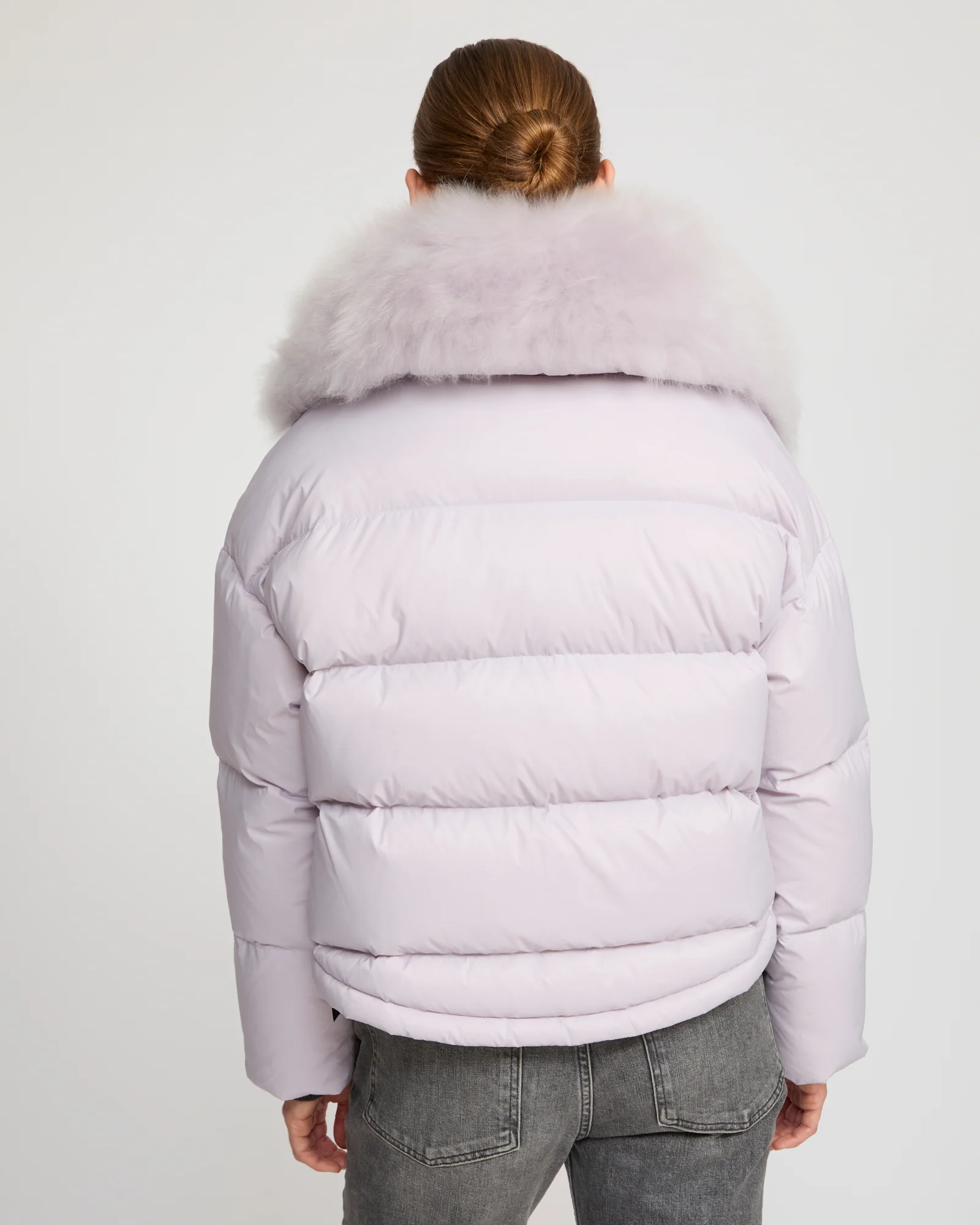 The short shape of this quilted parka can also be worn cinched at the hem. The jacket has been tested to -10°C to guarantee a perfect protection against the cold, while its waterproof cotton fabric is storm-resistant. A removable collar in long-haired, airy relaxed lambskin provides style and warmth.
