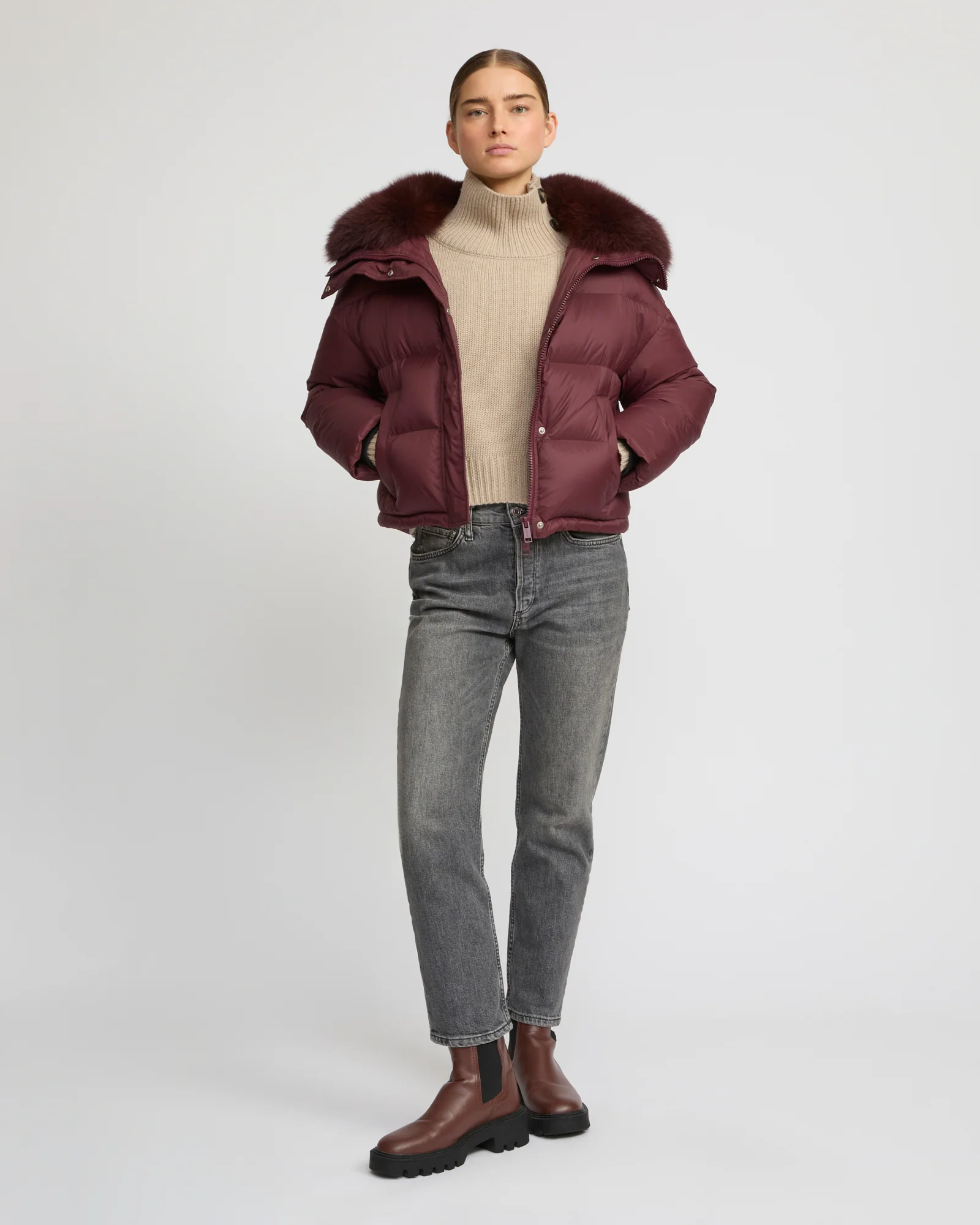 7/8 length down jacket with fox fur collar