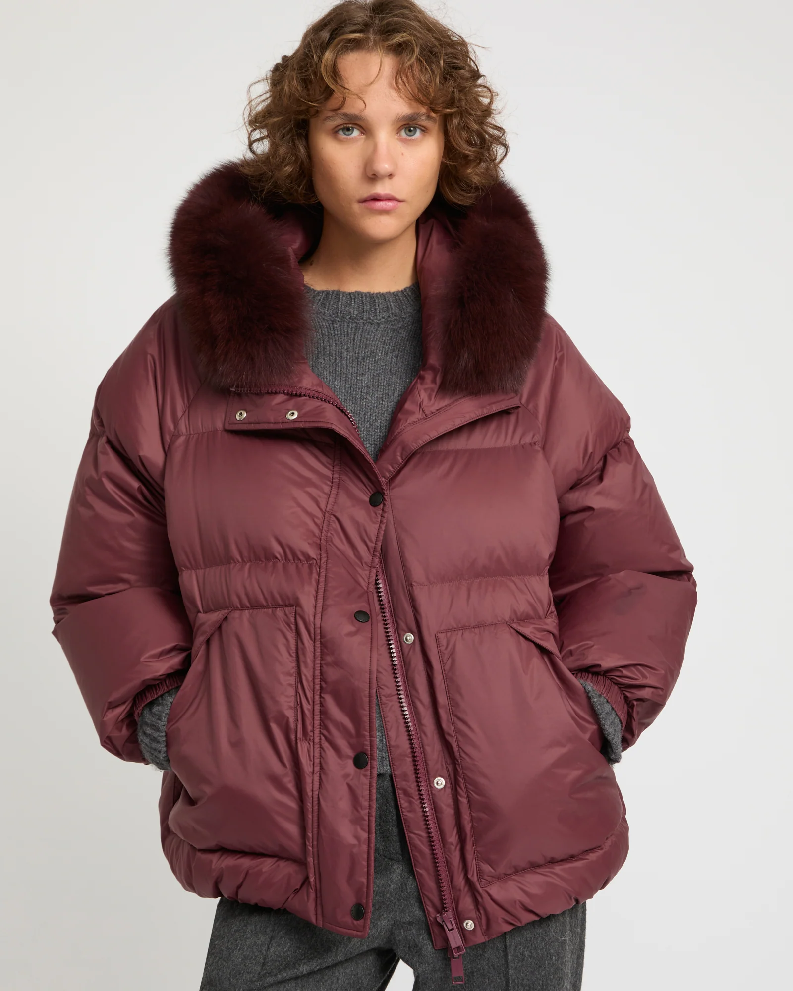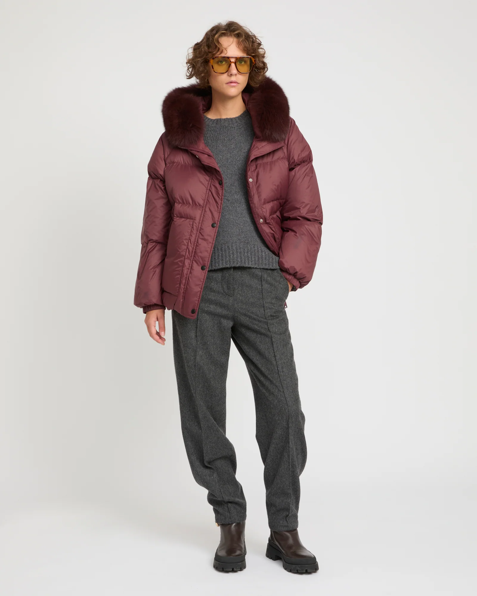 3/4 down jacket in water-repellent technical fabric with fox fur collar trim