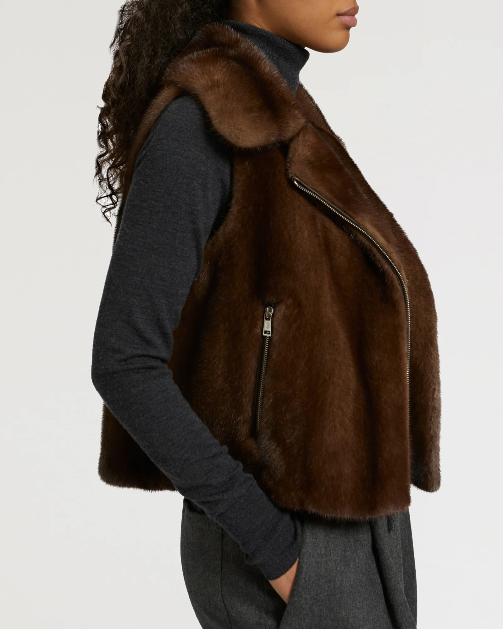 Somewhere between the sleeveless gilet and the leather biker jacket, this model has a distinctive style. Featuring an asymmetrical front zipper and two zip pockets, it plays with the classic codes of the biker jacket. To combine comfort with femininity, this warm and enveloping gilet is crafted from long-haired mink fur and fully lined with silk. An easy-to-wear and match piece to complete a silhouette and ensure a resolutely modern look.
