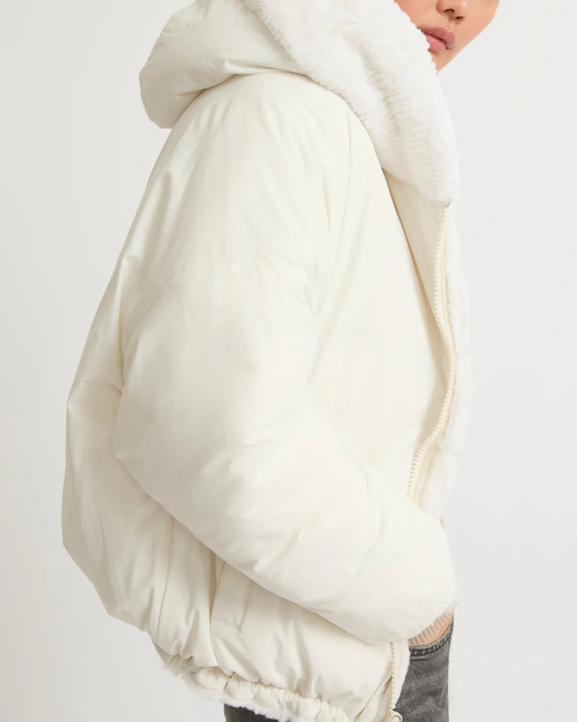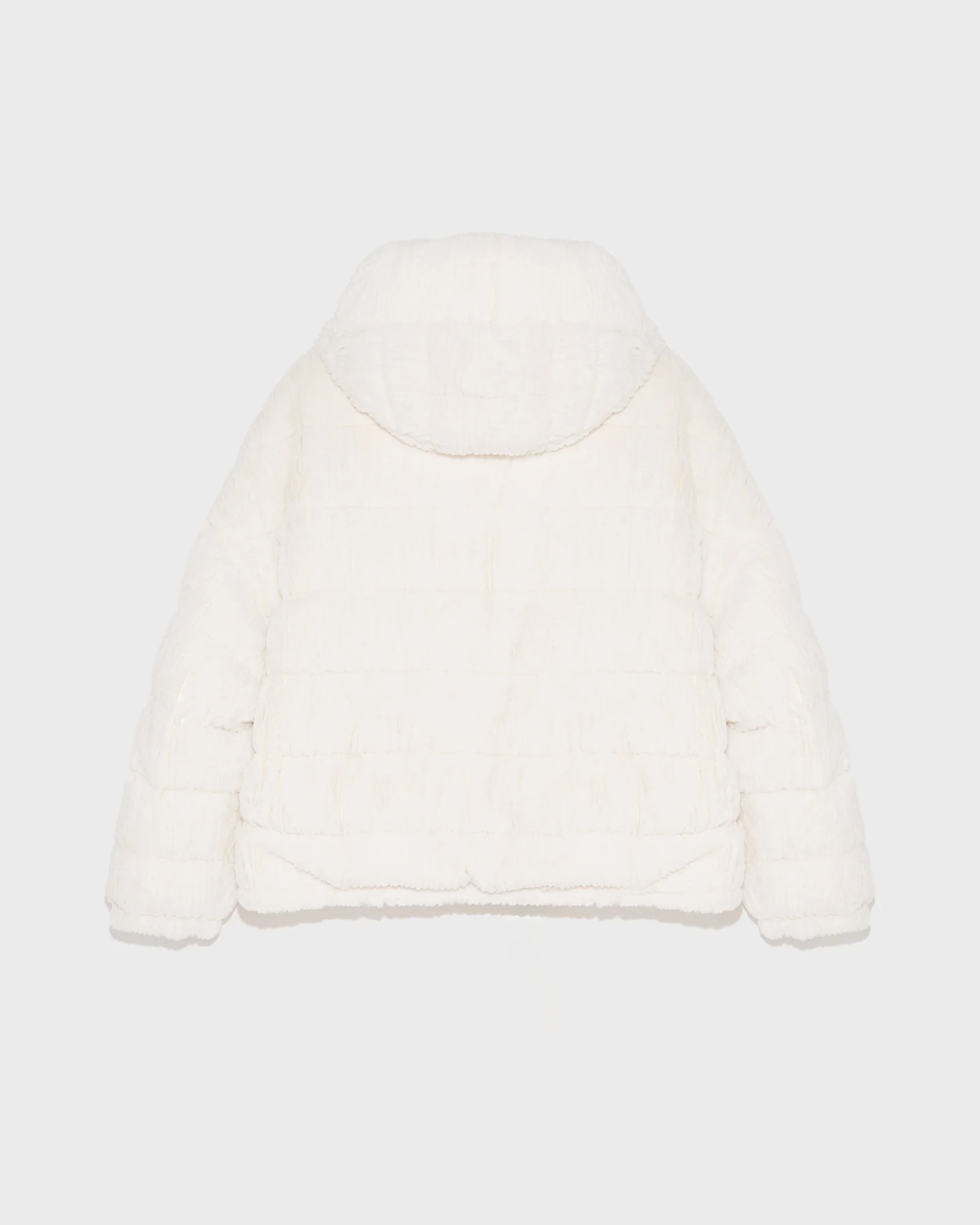 Versatility and elegance for this long down jacket which offers two contrasting sides : one in rex rabbit fur worked in ribbed stripes, and the other in technical fabric suited for harsh weather conditions. The hood is also reversible. With its waist-length cut, the coat is the perfect companion for every occasion.
