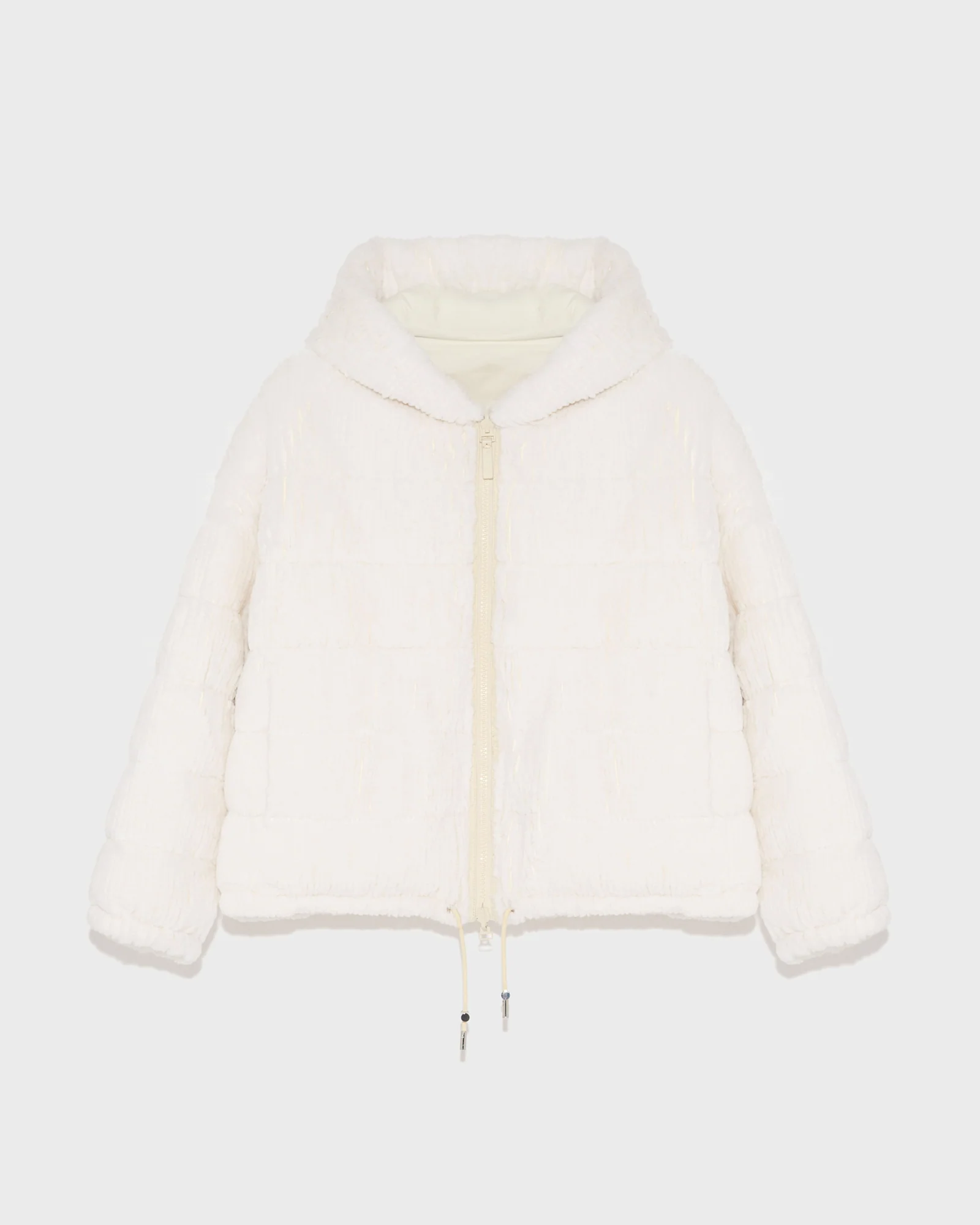 Short hooded down jacket in technical fabric reversible ribbed rex rabbit fur