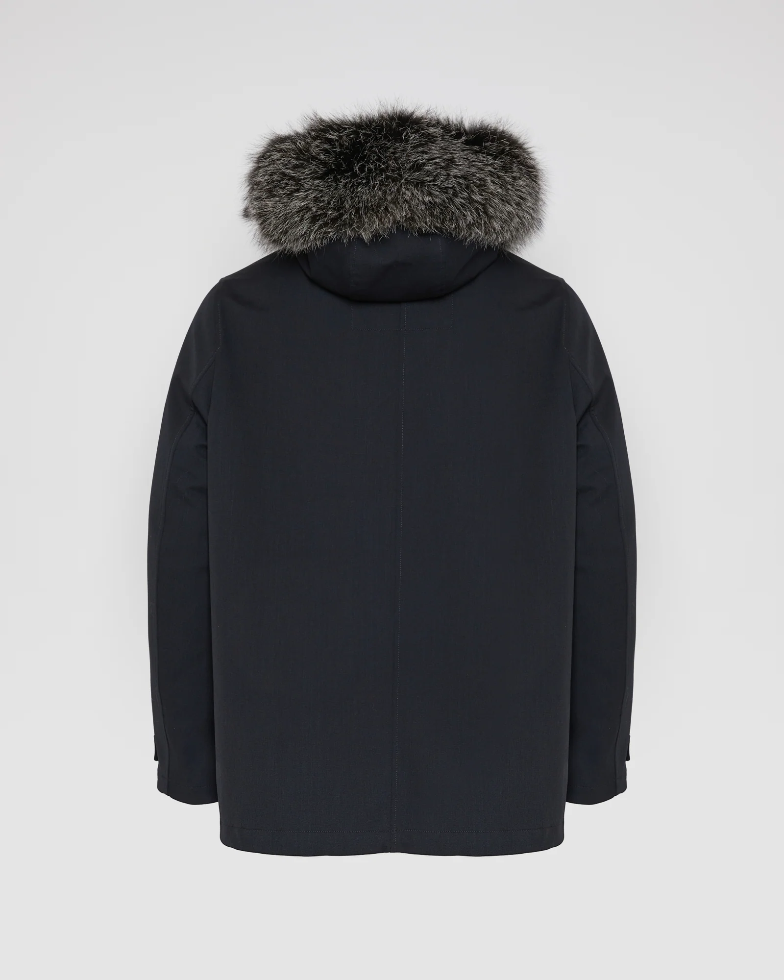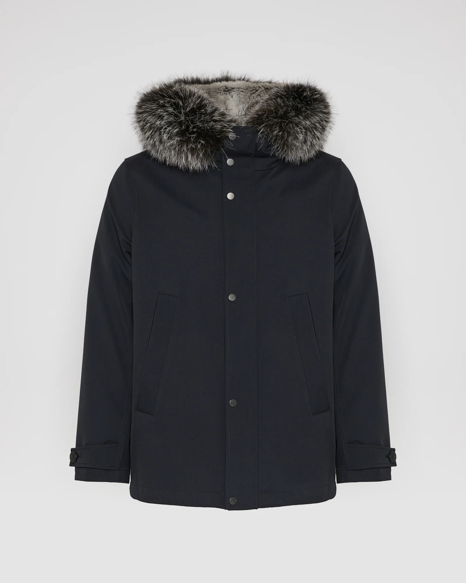 Versatility, warmth and elegance for a short parka with classic lines, worked in a technical wool fabric with weather and time-resistant properties. A first inner lining in highest quality down provides constant warmth, while a second removable lining in rabbit fur adds an extra luxurious touch.