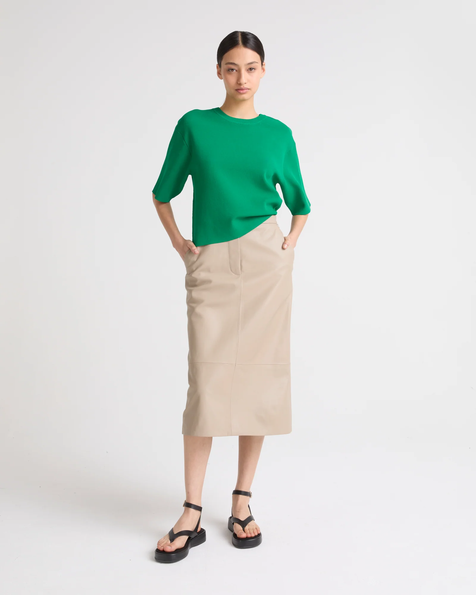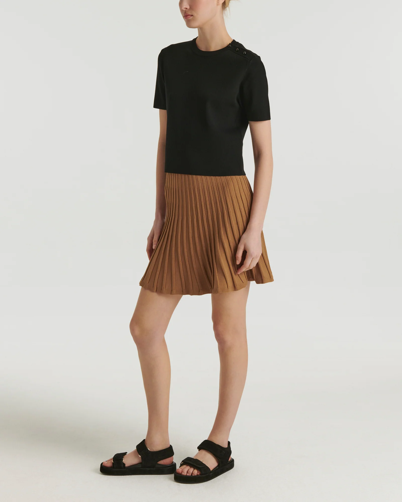 The A-line cut, fluid fabric and supple pleats of this short skirt skim the silhouette, bringing a lightness that is both sporty and elegant.