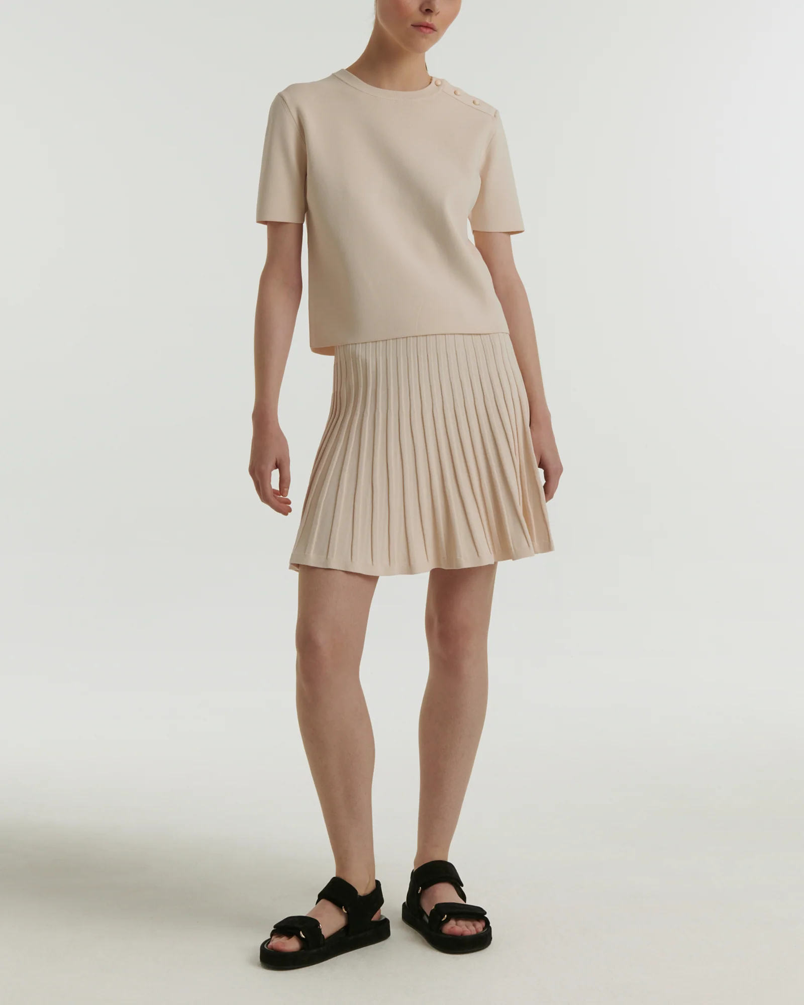The A-line cut, fluid fabric and supple pleats of this short skirt skim the silhouette, bringing a lightness that is both sporty and elegant.