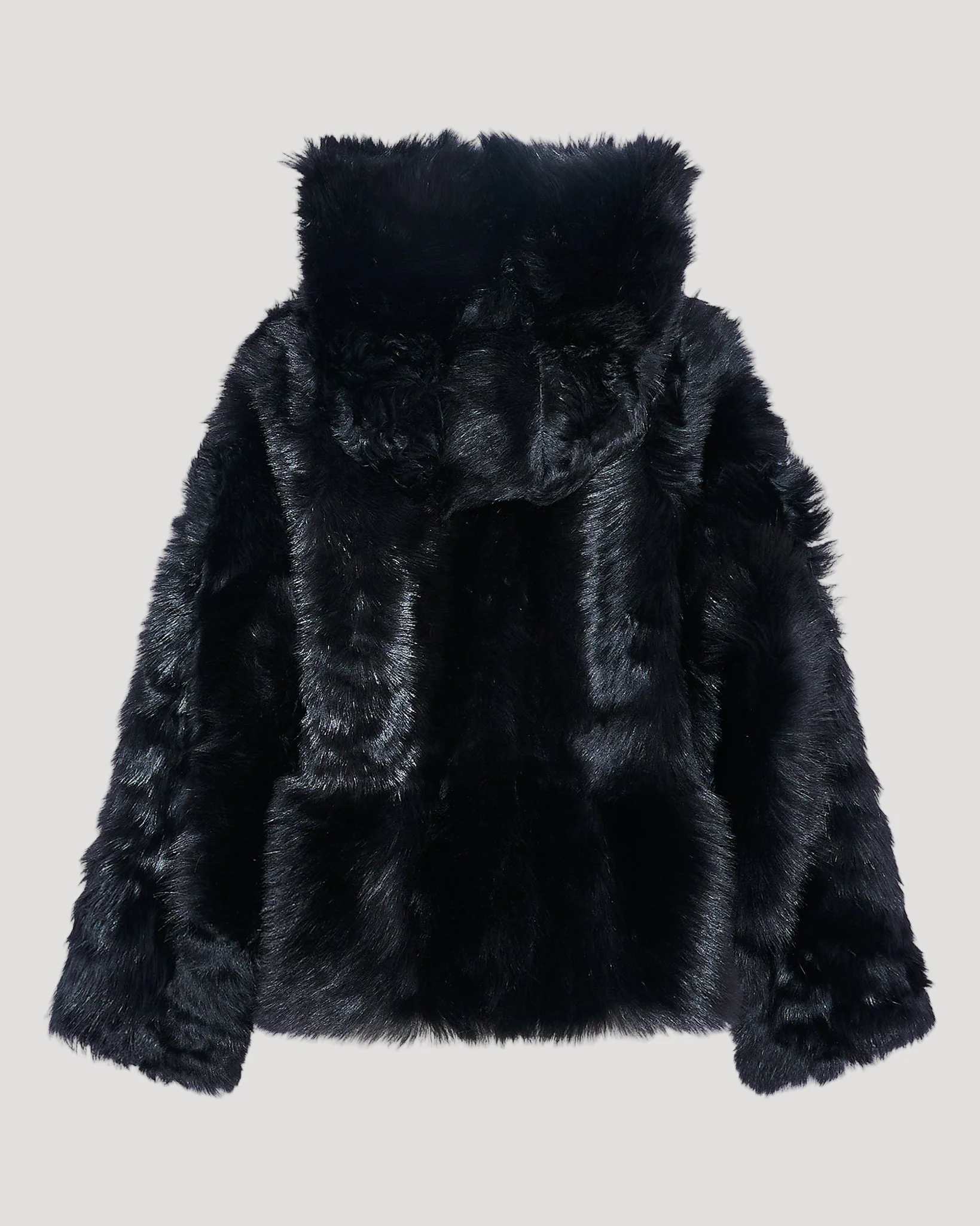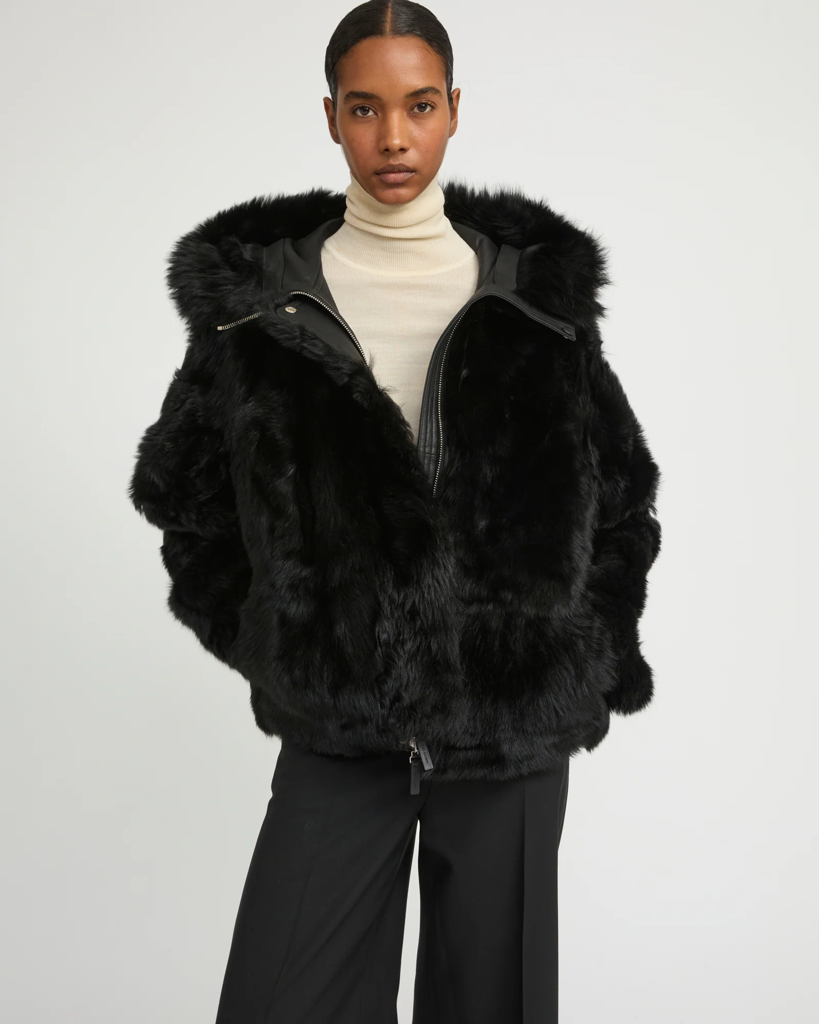 The generous texture of Appenzel Toscana shearling, with its semi-curly feel, showcases the clean lines of this short jacket. Matching leather details underline the leather work. The hood can be pulled in using a cord with toggle fastenings