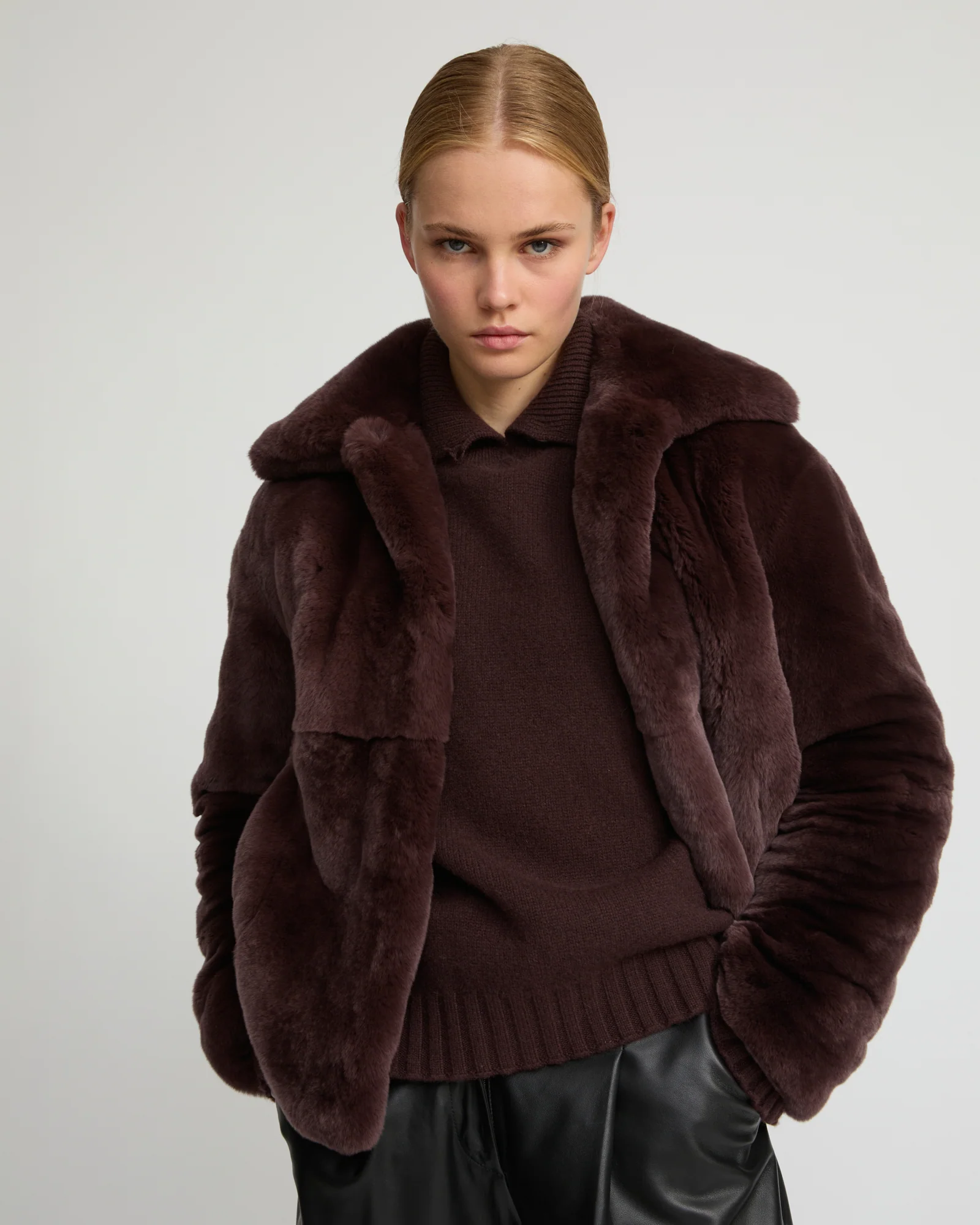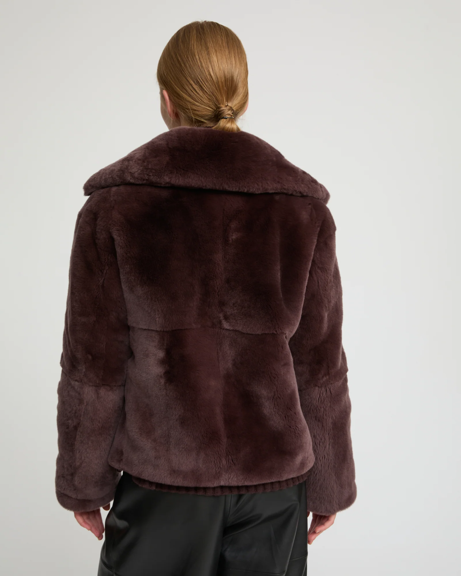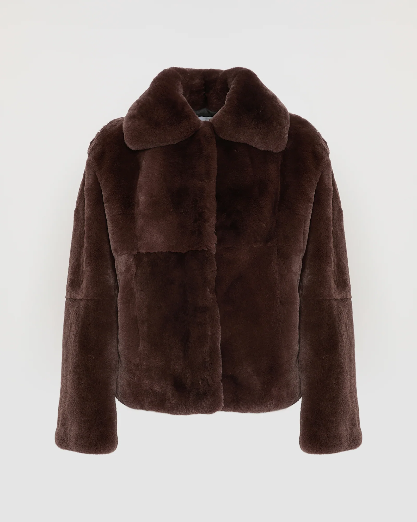 The elegant simplicity of a little jacket with a shirt collar, worked in softest rex rabbit fur. The front hook fastening provides a discreet, clean finish.