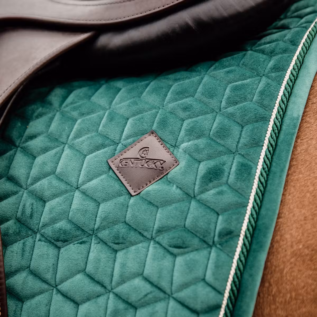 Le tapis de selle Velvet Jumping Kentucky en vert forêt incarne une élégance sobre et authentique. Sa finition effet velours apporte de la profondeur à la couleur, tandis que le matelassage en étoiles crée un relief délicat et raffiné. Le passepoil à double torsion vient souligner les lignes du tapis avec précision, renforçant son allure haut de gamme.