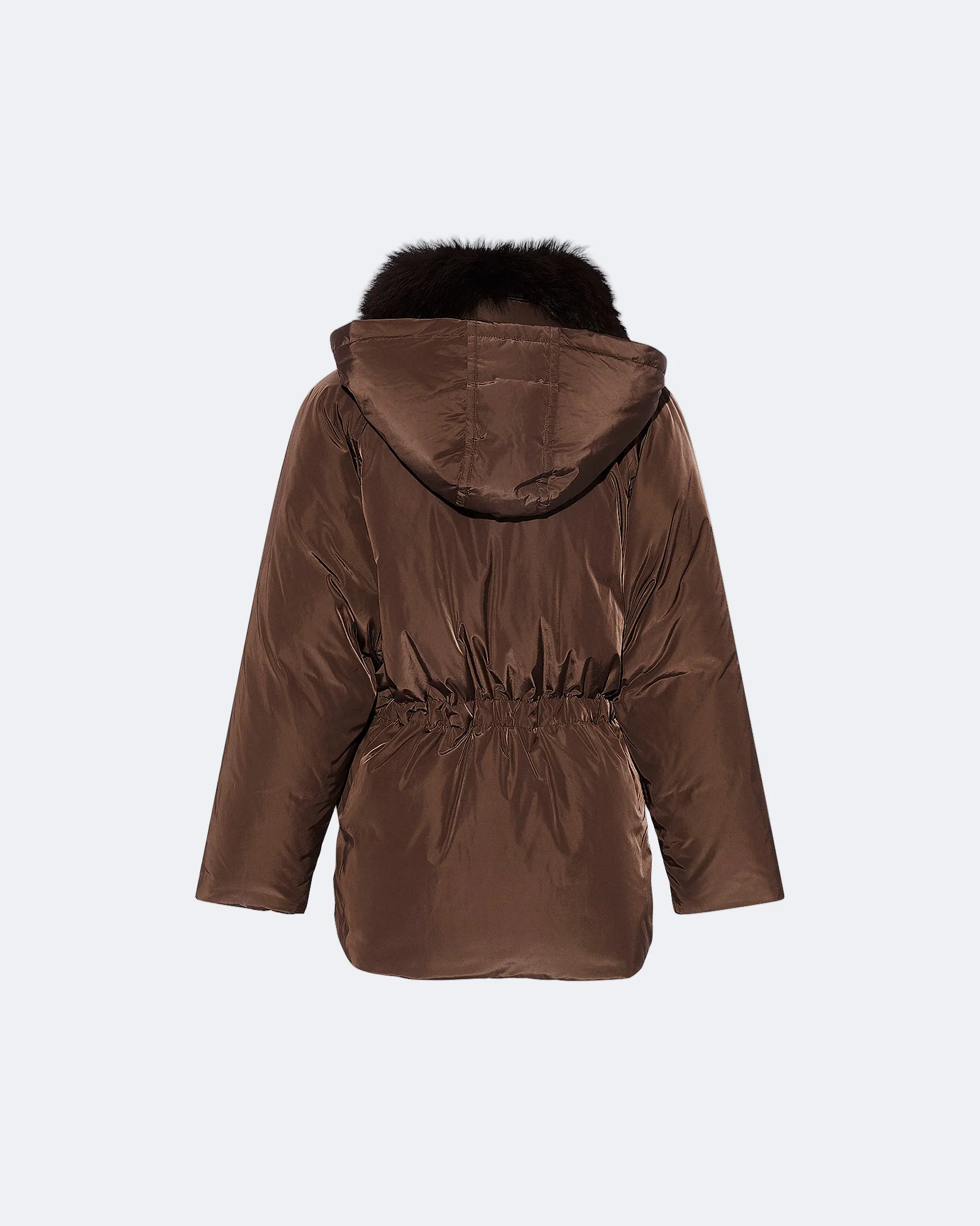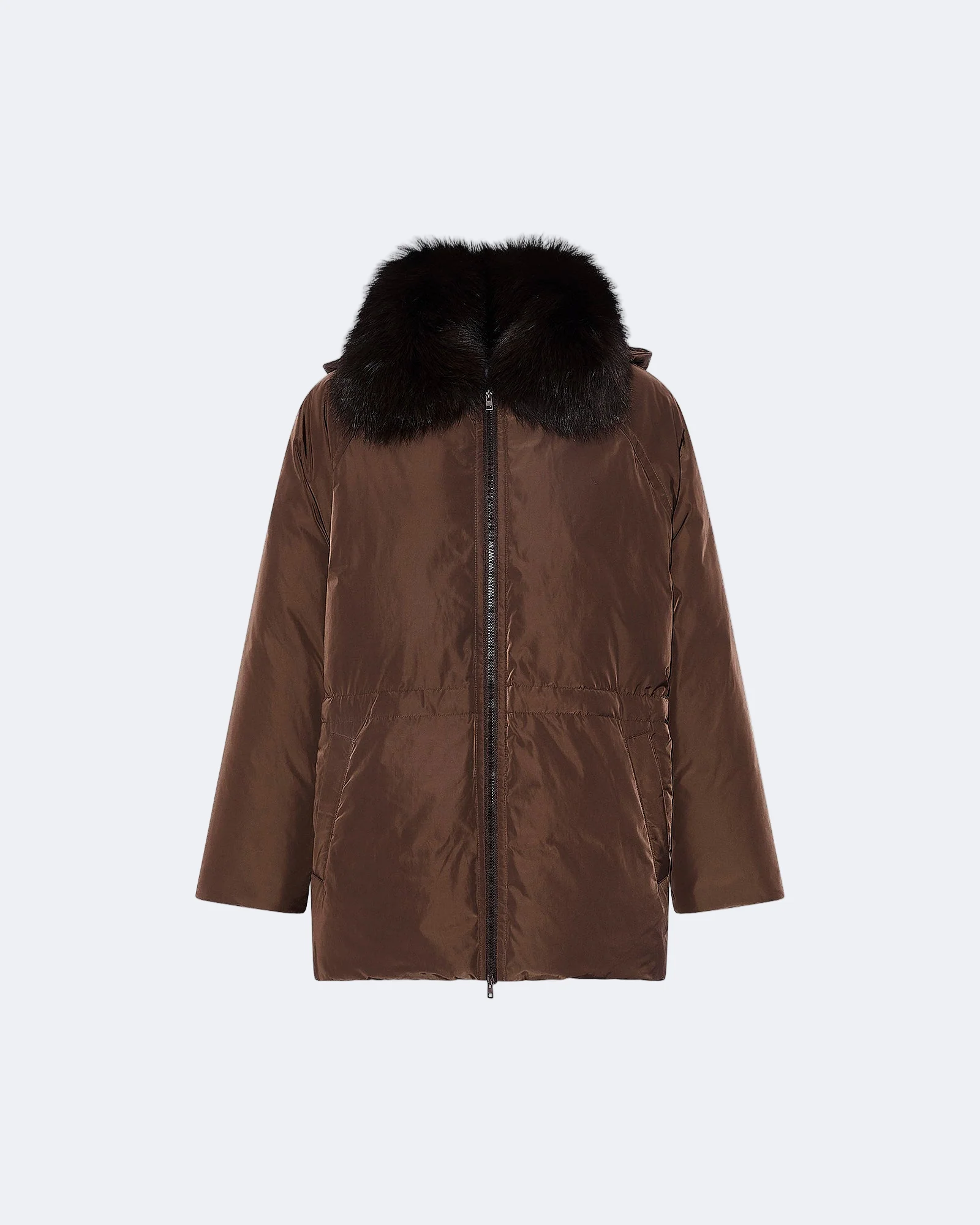 Down cape in matte technical fabric. – Smooth down cape– Length: 78 cm– Removable fox fur collar– Elasticated waist inside– Welt pockets– Centre front zip closure– Lined.