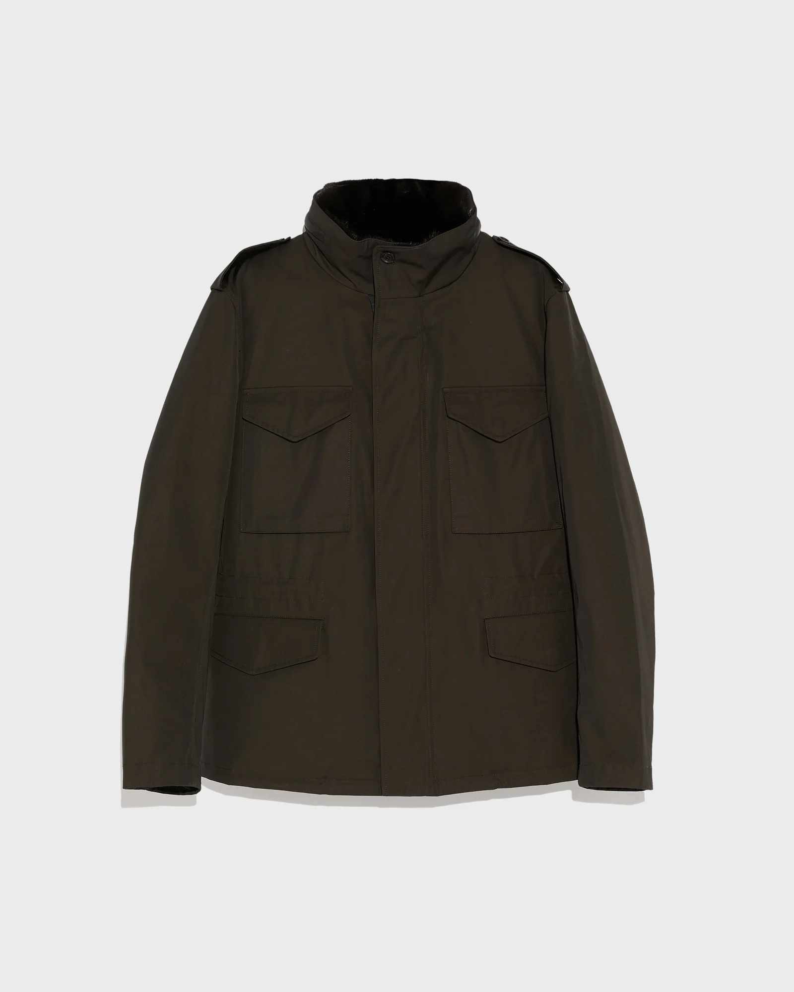 Taking its stylistic inspiration from the classic field jacket, this design is perfectly suited to face the trials of winter with elegance. Its technical gabardine fabric is proofed against all conditions, whilst providing a discreet shine. As well as its numerous practical pockets, the coat also features a multitude of clever details including a hodd hidden in the collar. A mink collar lining provides additional warmth and distinction for a timeless design, suited to all occasions.
