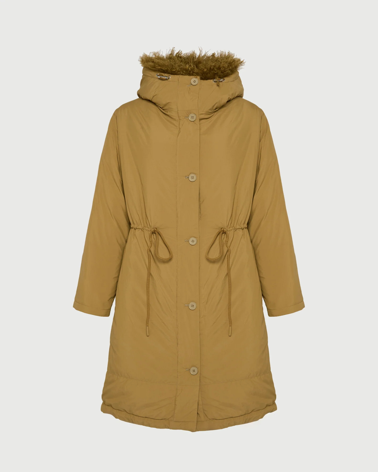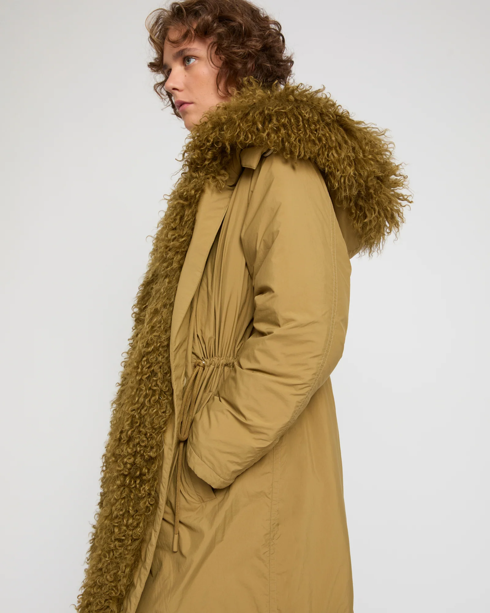 Light yet stylish, this padded parka combines functionality and elegance with its combination of water-repellent technical fabric and a curly lambskin lining for the hood and front. A drawstring waist allows this fishtail design to be worn cinched.