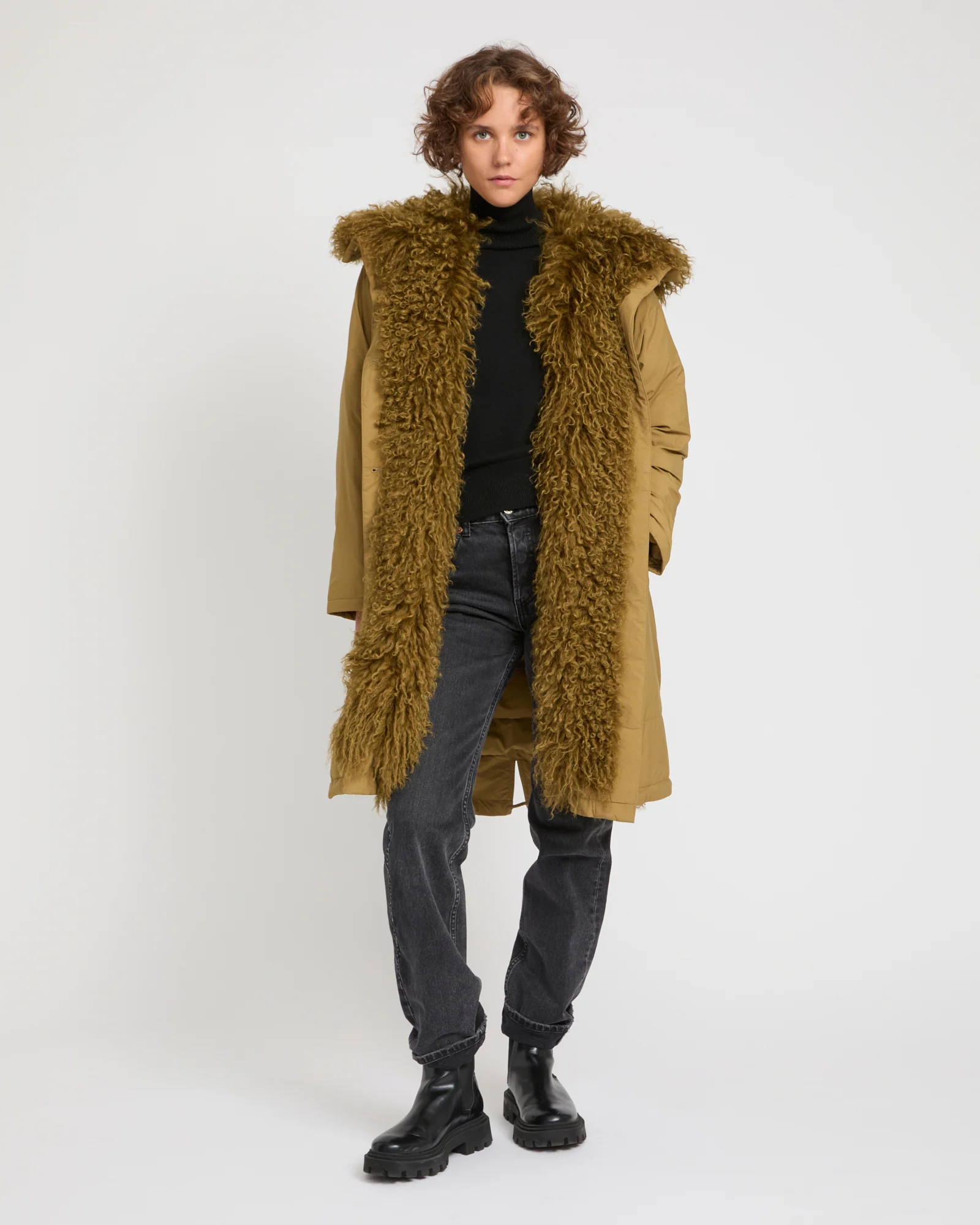 – Front and inside hood trimmed with braided curly long-haired lambskin